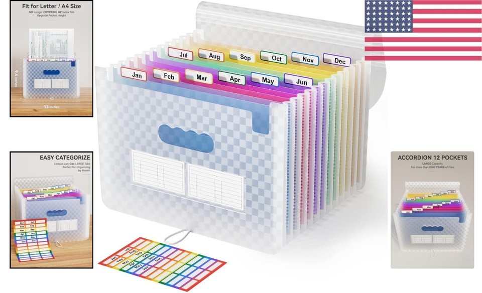 Features: Business Card Holder,Fastener Included,Heavyweight,Moisture Resistant,12 Pockets,Accordion File Organizer,Expandable,Portable,Monthly Bill Organizer,Document Organizer,Easy Categorize,Unique Jan-Dec Tabs,Color Inner Pages,Upgrade Pocket Height,Durable,Sturdy,Stand Stably,Organizing by Month,Release Your Home Space,Collapses Small