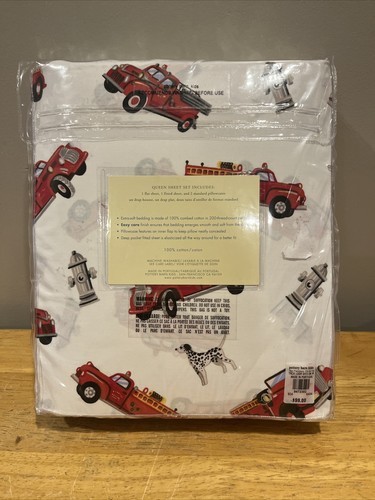 This is a queen-sized sheet set from Pottery Barn Kids, featuring a firetruck pattern with dalmatian dog accents. The set includes a fitted sheet, flat sheet, and two pillowcases, all made from 100% cotton and machine washable. It is part of the Pottery Barn Kids product line and is perfect for a boy's bedroom.