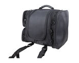 Made from water resistant Textile 2 Quick Releases Includes rain cover Lots of extra adjustable tie downs and shoulder strap are included The center compartment is extra large and has two extra end storage compartments that open giving easy access from either side. Expandable side compartments on each side. D-rings all around the bag for easy additional attachments. Wide adjustable Velcro and belt to attach the bag to any sissy bar back rest big or small Can also be used on luggage racks.