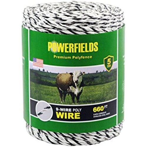 POWERFIELDS 9 Wire poly wire combines UV treated black and white contrasting polyethylene monofilament and stainless steel electrical conductors for maximum visibility, strength, and performance. Ideal for temporary or permanent enclosures and rotational grazing.