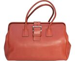 Elegant and timeless, this authentic Prada top-handle bag is crafted from supple, grained leather in a warm red tone. Its structured, doctor-style silhouette is both classic and practical, featuring double rolled handles and a central leather strap with a silver-tone buckle closure.