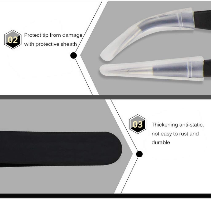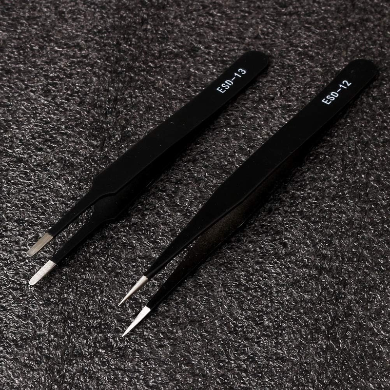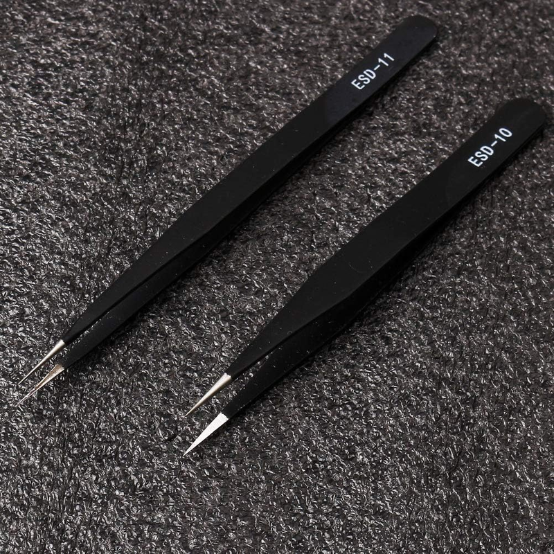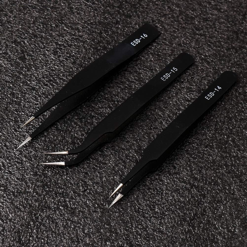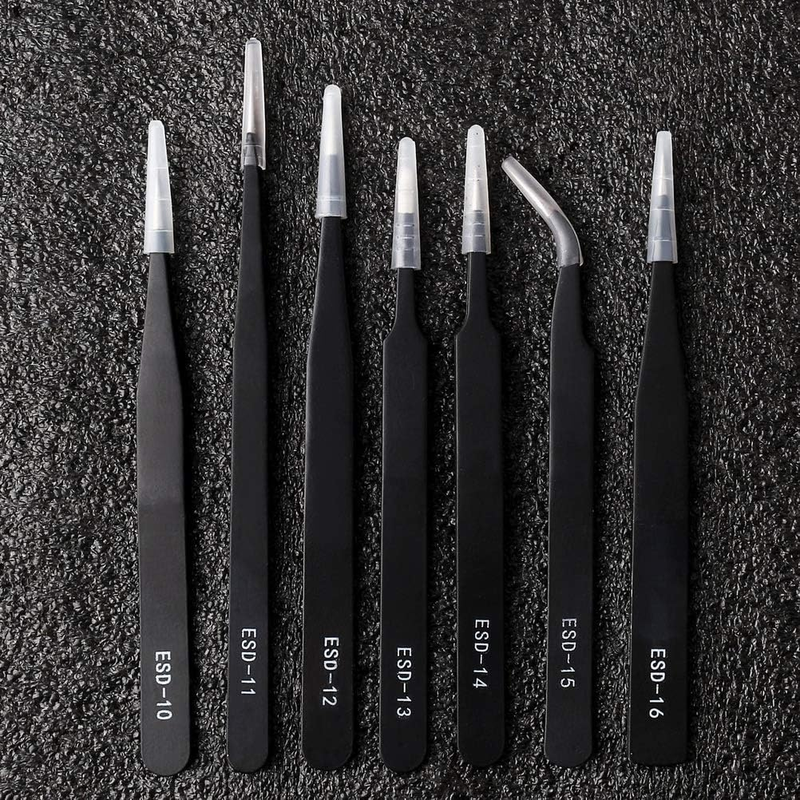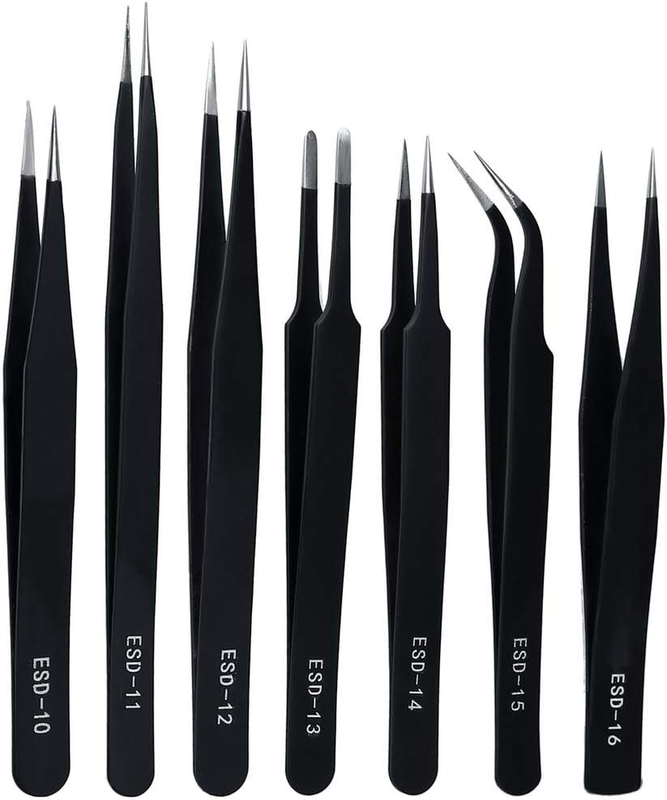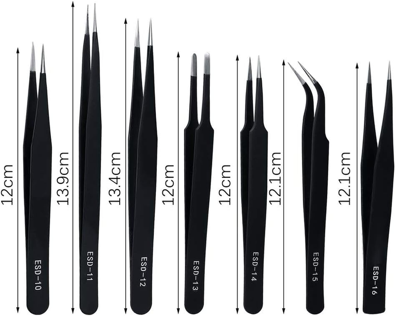 INCLUDE - 7 pieces anti-static tweezers (if you have received wrong product please contact me, thank you) COLOR - black MATERIAL - stainless steel SIZE - 12,13.9,13.4,12,12,12.1,12.1cm If you encounter any problems with the product, please feel free to contact us at any time. We will solve your problem as soon as possible. Package includes: 1 pc. ESD-10 fine tip, straight (122mm) 1 pc. ESD-11: fine tip, straight (140mm) 1 pc. ESD-12: fine tip, straight (135mm) 1 pc. ESD-13: rounded spade tip, straight (122mm) 1 pc. ESD-14: super fine tip, straight (122mm) 1 pc. ESD-15: fine tip, angled (122mm) 1 pc. ESD-16: heavy-weight pointed tip (123mm)