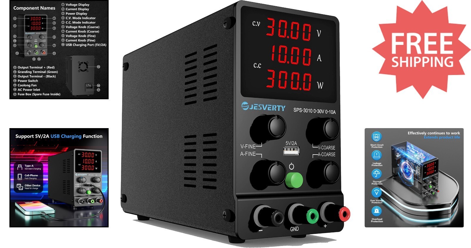 The Jesverty SPS Series is a compact, reliable power supply featuring a vivid 4-digit LED display with up to 0.01V, 0.001A, and 0.1W resolution, providing real-time measurement of output voltage, current, and power. Equipped with automatic switching between constant voltage and constant current modes, it adapts seamlessly to changing loads?setting your desired parameters at the crossover points. Its lightweight design (approx. 2.5 lbs) and small footprint make it ideal for versatile use on your workbench. Built with high-quality materials and multiple safety protections?including short-circuit, overload, and temperature regulation?the SPS Series ensures safe, long-lasting performance. Each package includes the SPS unit, power cord, leads, and a comprehensive manual with contact info. For optimal safety and performance, consider using leads with adequate current capacity for your specific projects. To ensure fast and reliable delivery, we work with multiple fulfillment partners and suppliers. Depending on availability and location, your order may ship from different warehouses or arrive in packaging that varies from item to item. Tracking details are typically provided shortly after shipment, and customer satisfaction remains our top priority.