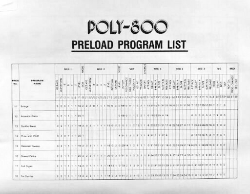 Preload Program List Sheets for Korg POLY-800 Synthesizer Keyboard.