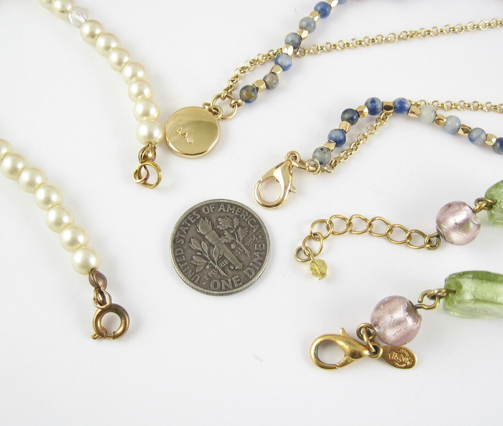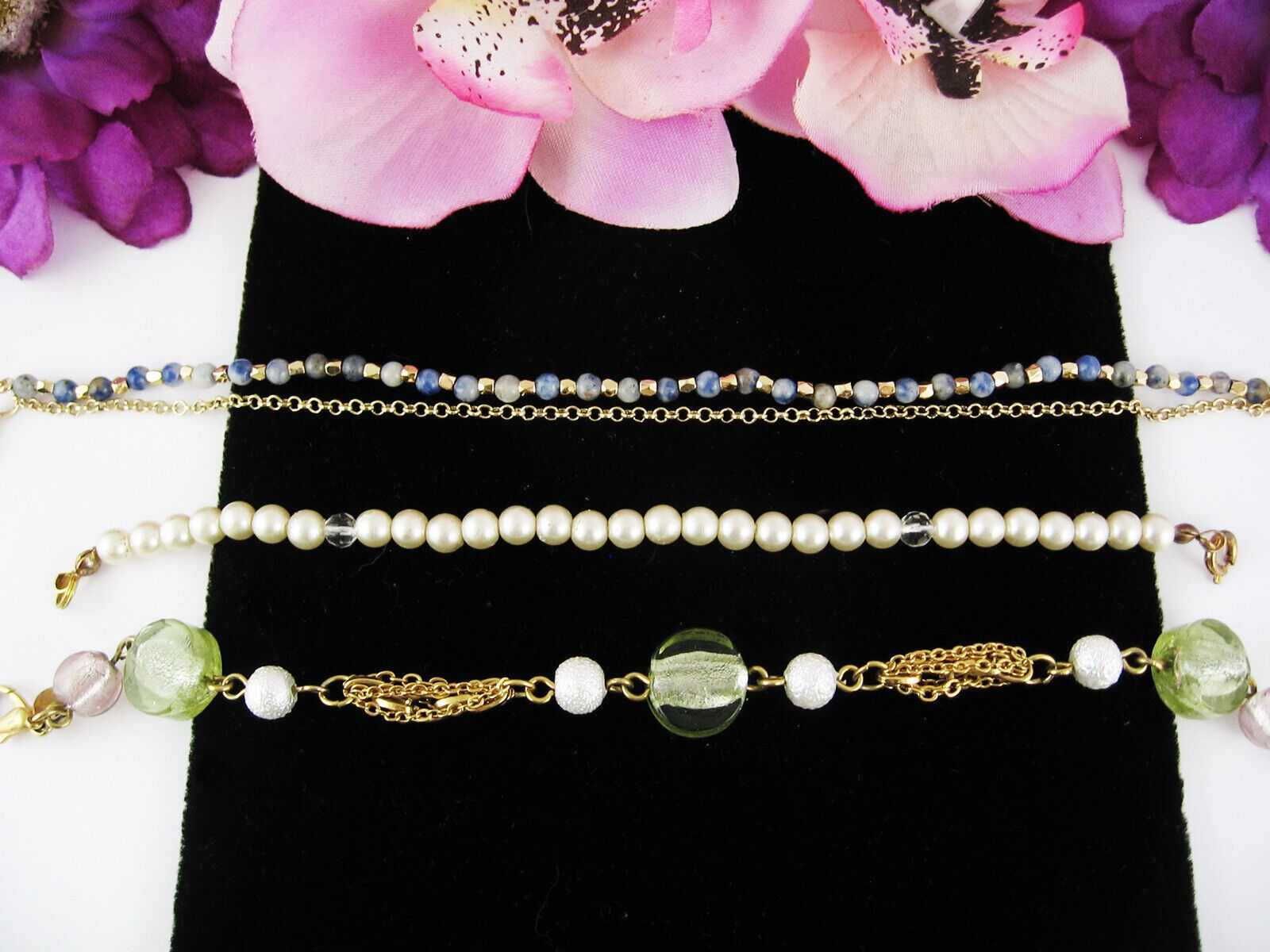 PREMIER DESIGNS LA Lot of 3 Vintage BRACELETS Green Glass Blue Cream Beads This is a vintage LOT of 3 BEADED BRACELETS! Two of which are Designer Signed and have GLASS BEADS! PREMIER DESIGNS: With a lobster clasp and an extension chain, this bracelet has three types of glass beads set in groupings of 3! A pale pink barrel shaped beads, a light green coin shaped bead and a textured white round bead! The pale pink beads are foiled inside and there are only 2 of them. The larger green coin shaped beads are also foiled, there are three of them. The textured white beads are the smallest and there are four of those. In between the groupings in the center are 5 small lengths of chain. There is a metal hangtag with the Premier Design logos. Measures 8" in full length. LA: With a lobster clasp this bracelet has TWO strands - one of small denim blue beads in various shades that alternate with goldtone metal squarish beads. The second strand is a thin goldtone metal chain. The metal hang tag is round and is decorated with tiny clear rhinestones. Measures 7 1/2" in length. FAUX PEARL: With a spring ring clasp, the bracelet has plastic faux pearl beads with a pair of clear bead. The bracelet measures 6 1/2" in length. WEAR ONE! WEAR TWO! WEAR ALL THREE AT THE SAME TIME! MATERIAL: Glass Beads, Glass foiled beads, Goltone metal beads, plastic faux pearl beads. METAL: Goldtone Metal TYPE: Beaded bracelets with clasps - two are lobster and one is spring ring. MEASUREMENTS: Premier Designs measures 8" in length, LA measures 7 1/2" and Faux Pearl bead measures 6 1/2". CONDITION: These pieces of jewelry are in pre-owned and vintage used condition. All three clasps are in full working order. All beads are present. There is a bit of scratching and finish wear present. Just Jewelry by mrzipmdo