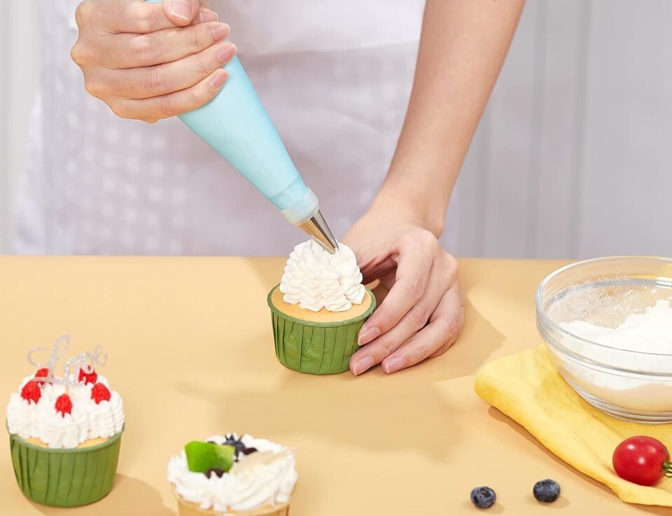 Versatile tools allow for intricate artwork on cakes and cupcakes.