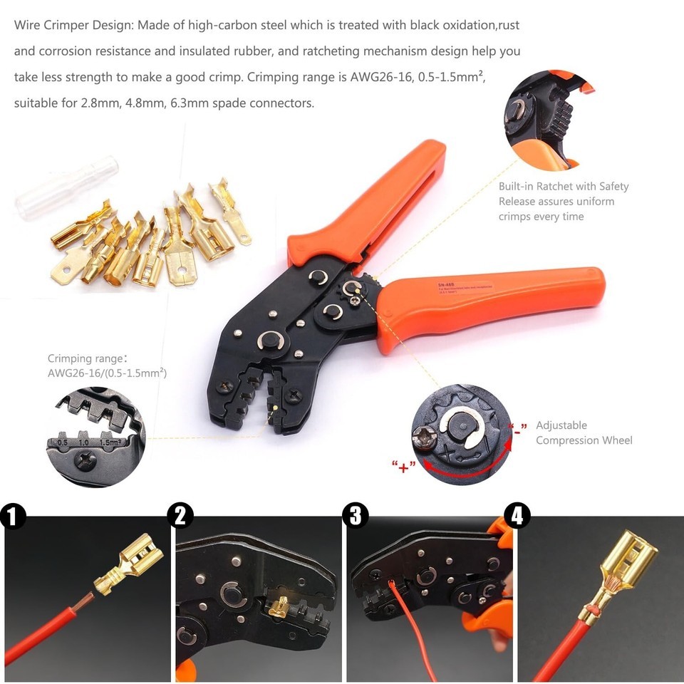 Complete Package: Includes the SN-48B wire terminals crimping pliers, 640 pieces of quick splice male and female wire spade connector bullet connectors terminals crimp terminal block, as well as a wire stripper to meet all your wiring needs.