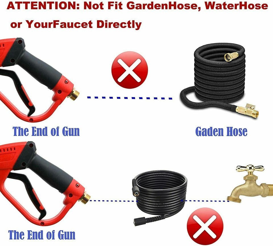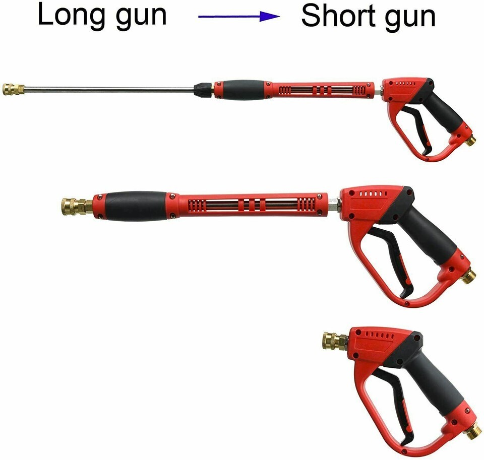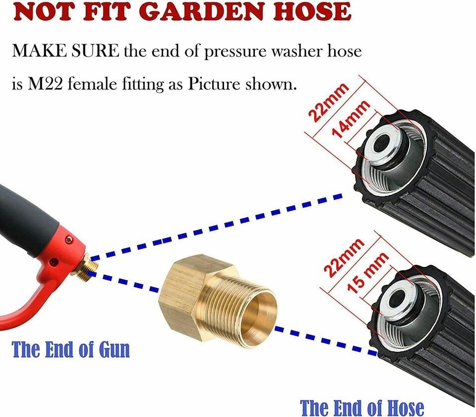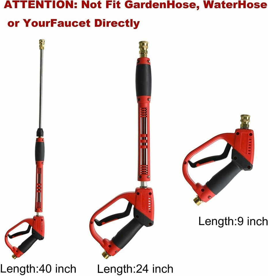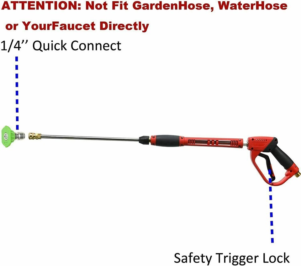 US Warehouse - FREE FAST Shipping in USA Product Description: Tool Daily: The Great Brand for Pressure Washer Accessory Tool Daily are committed to developing more efficient and safer pressure washer accessory, helping people reducing the tiredness of spraying and cleaning. We are known for amazing pressure washer accessory, such as nozzle, wand, gun, coupler, foam cannon. " ATTENTION: Not Fit GardenHose, WaterHose or YourFaucet Directly" 1. Max pressure is up to 5000 PSI. 2. Max Temperature of water is rated to 60? / 140 F. 3. M22 male NPT fitting. 4. 1/4?? standard quick connector 5. Adjustable length: 40 inch, 25 inch, 8.8 inch. Tips 1. Please make sure your pressure washer hose is Metric M22 female thread fitting. 2. If hose has M22 14mm fitting with 14mm inside diameter, please connect to hose directly. 3. If hose has M22 15mm fitting with 15mm inside diameter, please connect the brass coupler to gun and hose. Please use Teflon tape on the male thread end on the coupler attached. 4. If pressure washer hose end is 3/8? female quick connector, you need M22-14mm male to 3/8? female adapter to fit. You can buy it in our store on amazon. 5. If you are not sure the size of your pressure washer hose, please connect us for help. 6. Our pressure washer gun not fit gardenhose. And no adapter to fit on Amazon. Please keep an eye for this. Specifics: ATTENTION: Not Fit GardenHose, WaterHose or YourFaucet Directly". Max pressure is up to 5000 PSI. Max flow rate is 8 GPM. Max Temperature of water is rated to 60? / 140 F. Pressure washer guns have M22 fitting, compatible with M22 14mm and M22 15mm fitting. M22 14mm fitting is compatible with Generac, Simpson, Briggs Stratton, craftsman, karcher, Ryobi pressure washer. M22 15mm fitting is compatible with Sun Joe, Campbell, MI-T-M, AR Blue, Stanley, Cleanforce, Simoniz, Excell power washer. If hose has M22 14mm fitting with 14mm inside diameter, please connect to hose directly. If hose has M22 15mm fitting with 15mm inside diameter, please connect the brass coupler to gun and hose. Replacement pressure washer gun has three lengths to use. Three Length: 40 inch, 25 inch, 8.8 inch. Pressure washer wands are compatible with almost gasoline powered and electric powered pressure washers. Pressure washer wand extension has 1/4?? standard quick connector. Connects any accessories with 1/4?? plug to the gun. Such as nozzles tips, pivoting coupler, foam cannon, extension wand, surface cleaner, undercarriage cleaner, water broom. Safety trigger lock to prevent unintended operation. Pressure washer gun kit has 5 nozzles. Pressure washer nozzles have different angle (0, 15, 25, 40, 65 degree). Choose different nozzle according to your needs. Thank You for Shopping!
