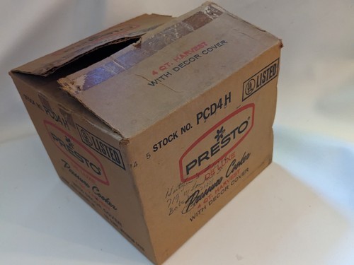 Up for sale is a new in open box Presto Pressure Cooker 4 Qt Gold Yellow Decor Lid Design Manual PCF4H A413A.
