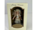 2004 DG Creations Pretty Woman porcelain collectible ornament. Features blonde curls, gold satin lace-trimmed dress, and bonnet. European-style, hand-painted, poseable porcelain arms and legs. New in box.