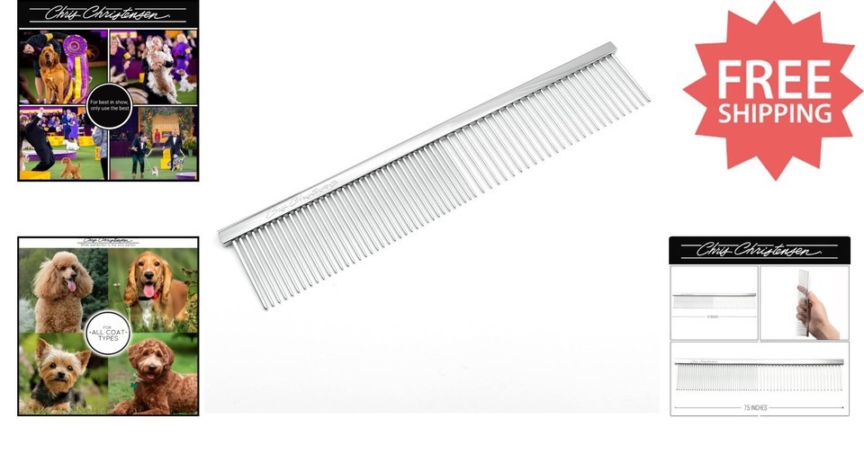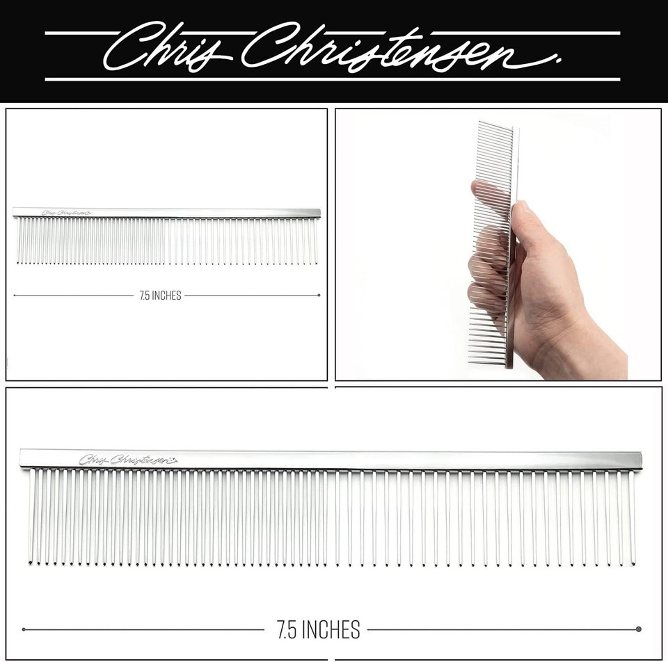 Elevate your grooming routine with our handcrafted, professional-grade combs, meticulously designed to meet your specific grooming needs. Crafted in Japan, each comb features a solid brass core with a flat spine and steel teeth finished with highly refined nickel chrome tips for durability and elegance. Rounded corners and grounded, rounded teeth ensure gentle, snag-free passage through coats, minimizing breakage and friction. The seamless and smooth design glides effortlessly through fur, making grooming a breeze. Trusted since 1996, Chris Christensen offers top-tier grooming tools rooted in a legacy of innovation and excellence in pet care.