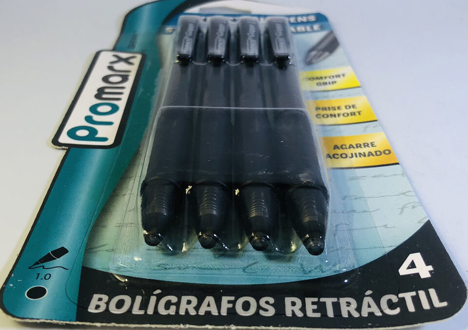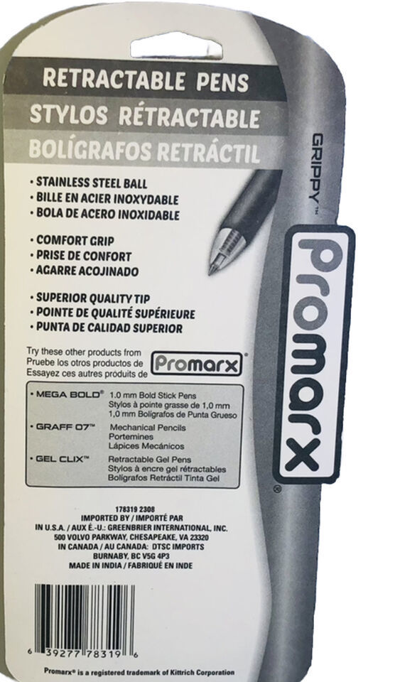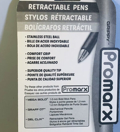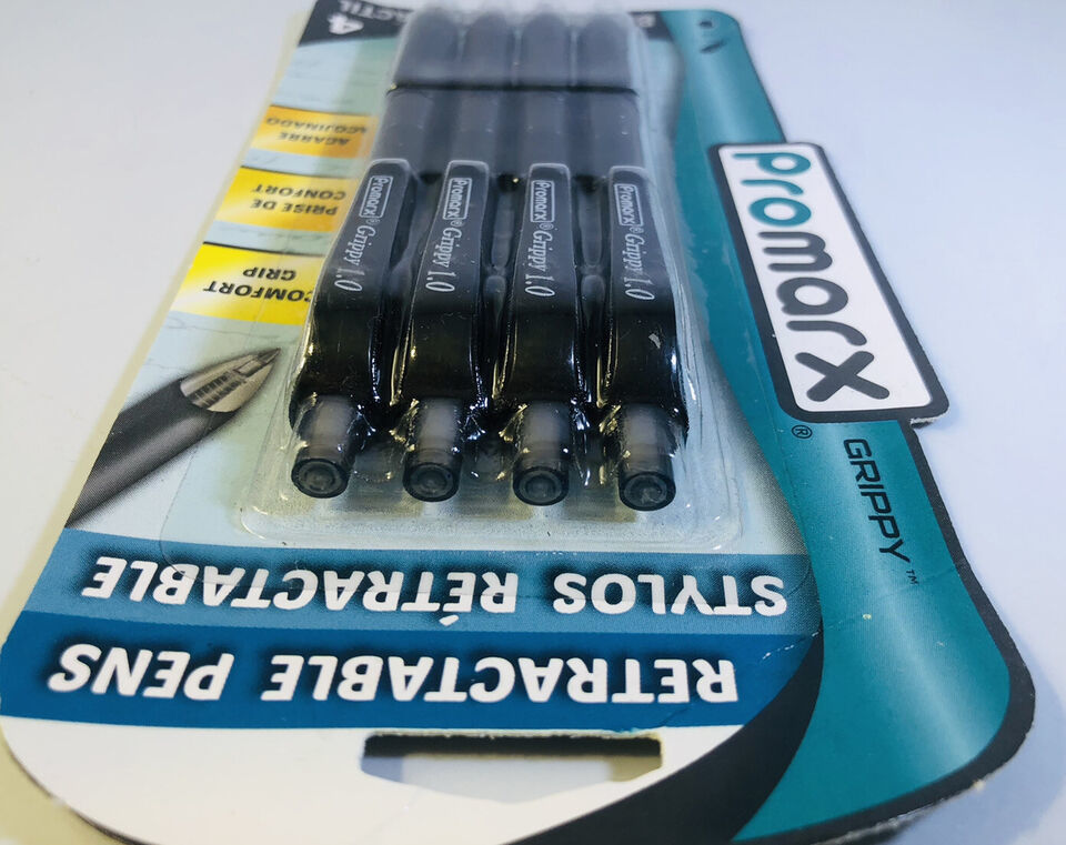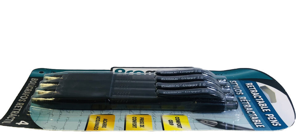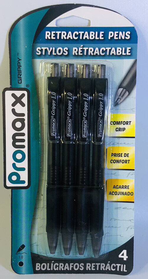 This is a pack of four Promarx Grippy retractable ballpoint pens with comfortable grip. Each pen contains black ink with a 1.0 point. The pens are made by Promarx and have a model name of Comfort Grip Gippy. The pens are brand new and have never been used. The pens are categorized under Business Industrial, Office, Office Supplies, Pens, Pencils Markers, and Ballpoint Rollerball Pens.