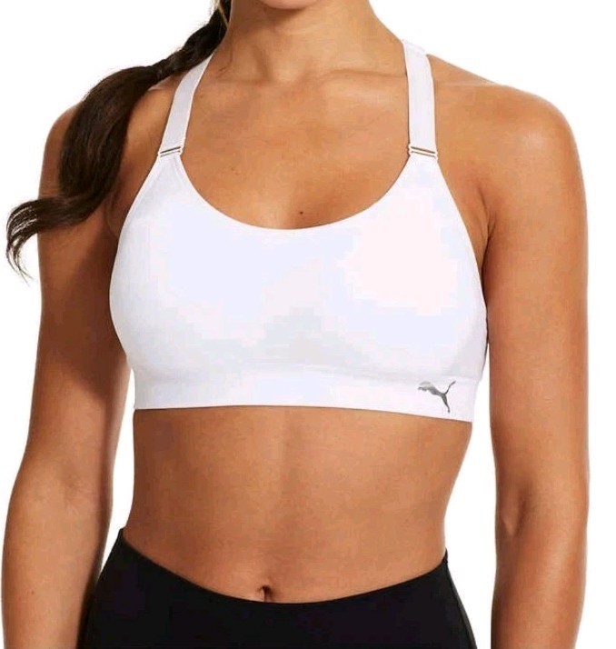 Puma Medium impact Moisture wicking Removable cups Wire-free comfort Racerback 360 degree seamless stretch Structured body mapping Puma coolcell moisture control Fabric Content: White: 90% Nylon | 10% Spandex