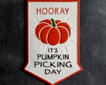 Here is a new fall wall sign and is made of metal and has a white finish with an ornge pumpkin on it and reads Hooray it's Pumpkin Picking Day, this sign measures 24.25 inch high by 14.5 inch wide, a medium to larger wall sign and hangs with sawtooth hangers, this will accent any larger wall space hanging for fall season.