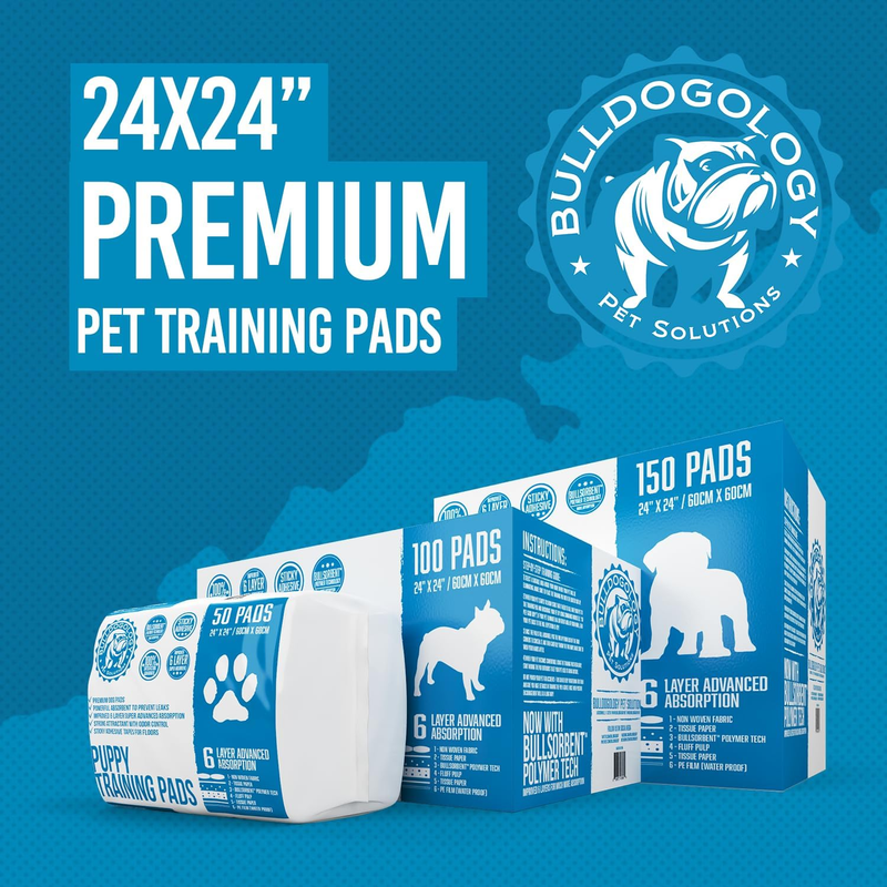 6 LAYER ABSORBENT: 50 Count Large 24x24 inch Puppy Pee Pads with new Bullsorbent Polymer Tech that instantly absorbs fast and turns liquid into gel, keeping floors, tiles, or carpets dry. Disposable pee pads for dogs that are easy for quick clean up!