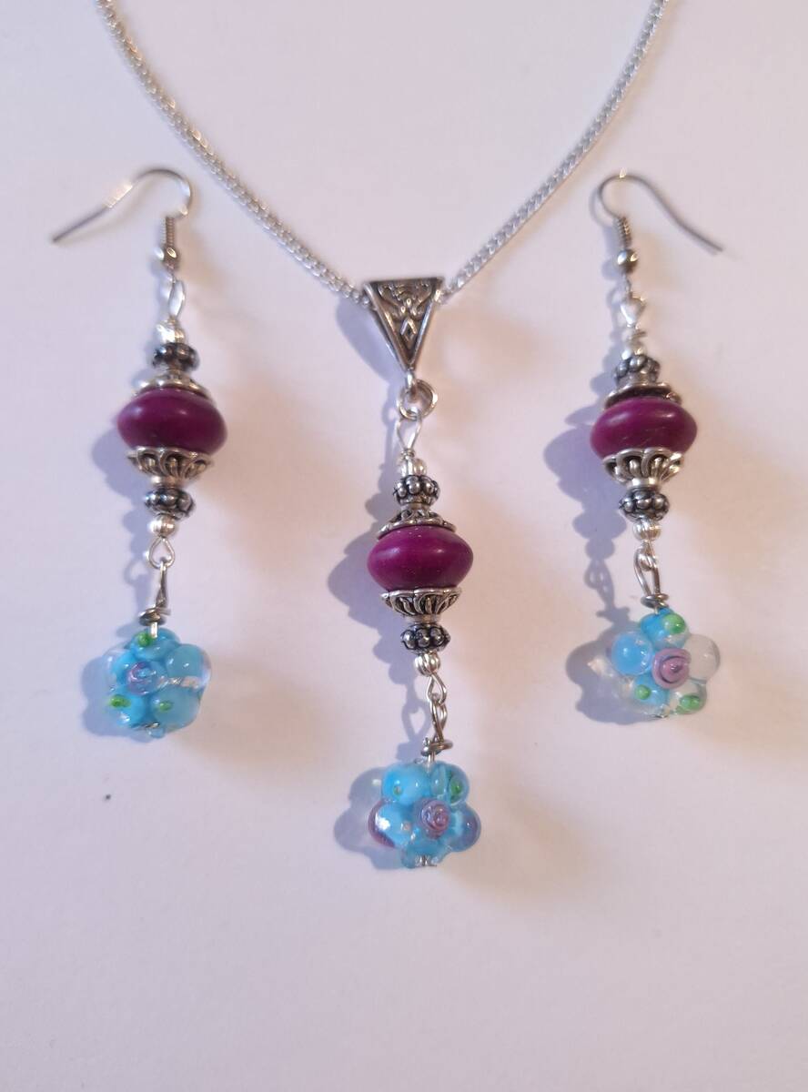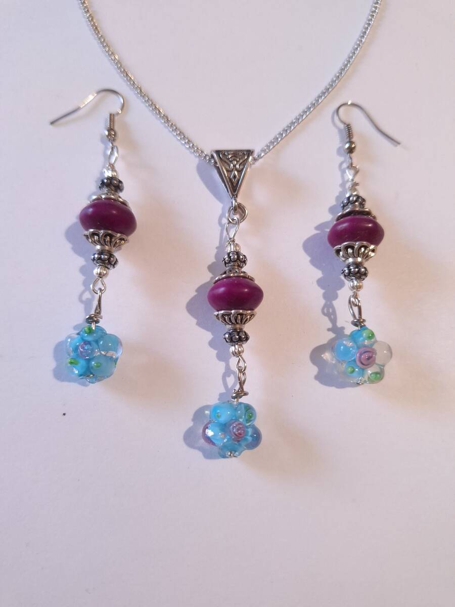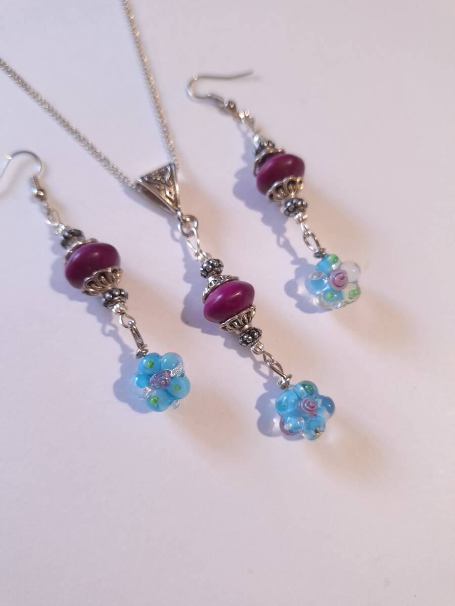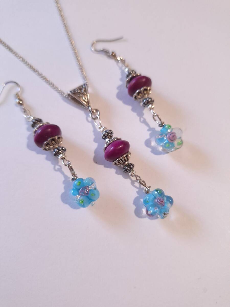 Purple Turquoise Murano glass Silver jewelry set necklace earrings Victorian purple Turquoise Murano glass blue flowers handmade jewelry set
