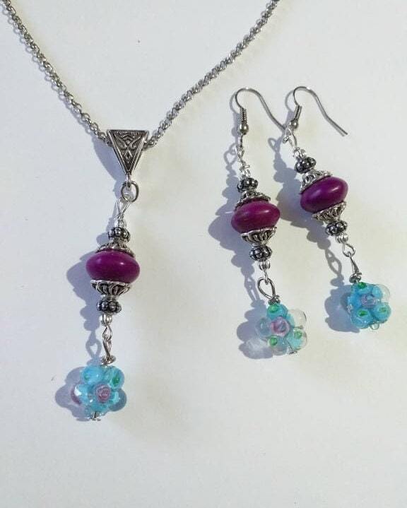Gorgeous jewelry set earrings and necklace made of purple disc Turquoise with a handmade Murano glass flowers in blue and rose pink tones. Victorian set necklace earrings Bohemian necklace and earrings .