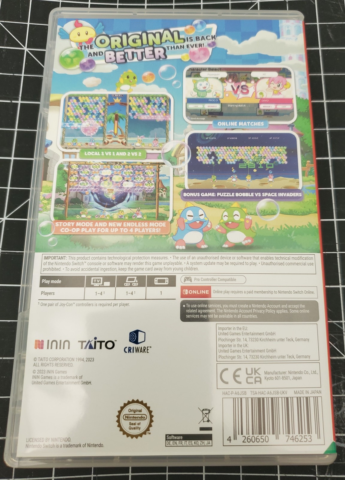 This game is Puzzle Bobble Everybubble! This is as released by Inin for the Nintendo Switch. This is as released for the EU region. I bought this new and played it through. The game runs fine.