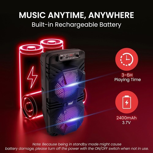 * RECHARGEABLE BATTERY: This Pyle PA speaker is great for karaoke, stage performances crowd control. It is fully portable, thanks to its built-in rechargeable battery w/ level indicator lights, and extending carry handle so you can take it anywhere