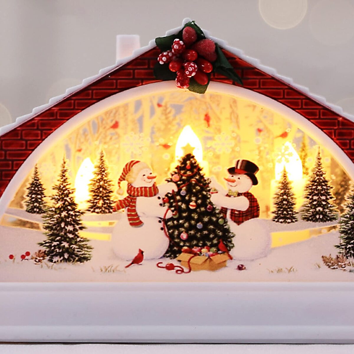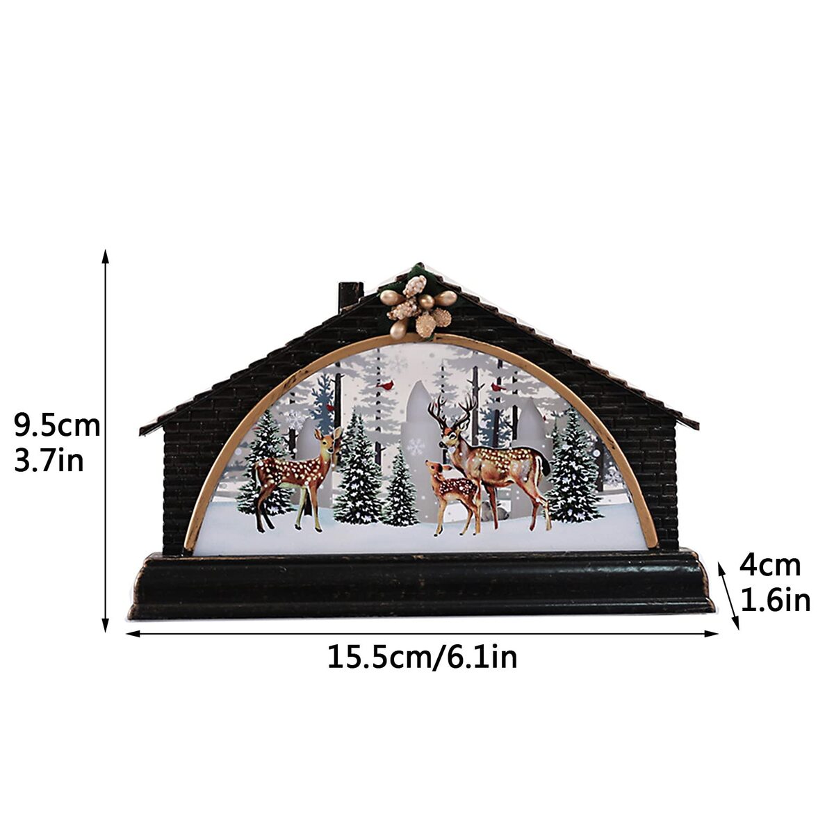 Product description: Features1. The LED Christmas booth can be used as a retro decoration gift crafts to be perfectly placed on any table or shelf.2. Phone Booth have a Highest quality, Vintage telephone booth designed, Perfect for decorative your room, A special gift for lover, Friends, Family.3. There is a Simulation Christmas tree inside, the surface of the lamp contains elements that match Christmas theme.4. This is a beautiful scenery, whether at school or at home.Perfect for decorating in the Christmas party or other festival.5. Batteries are included, One switch to turn on/off, very easy t use and the item will last for a long time of use.SpecificationMaterial: PlasticSize: 6.1x1.6x3.7inchPackage Includes:3 x Christmas Lantern
