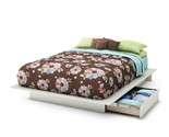Queen size Modern Platform Bed with 2 Storage Drawers in White Finish Platform Bed made of laminated particle board Pure White finish with finished top surface Headboard not included Full/Queen size Box spring not required Two practical storage drawers (one on each side) Full-extension metal drawer glides Contemporary style Made of EPP certified panels (Environmentally Preferred Product) Shrink-wrapped packaging with reinforced corners to reduce the risk of shipping damage Made in Canada Ready to assemble Manufacturer 5-year limited warranty