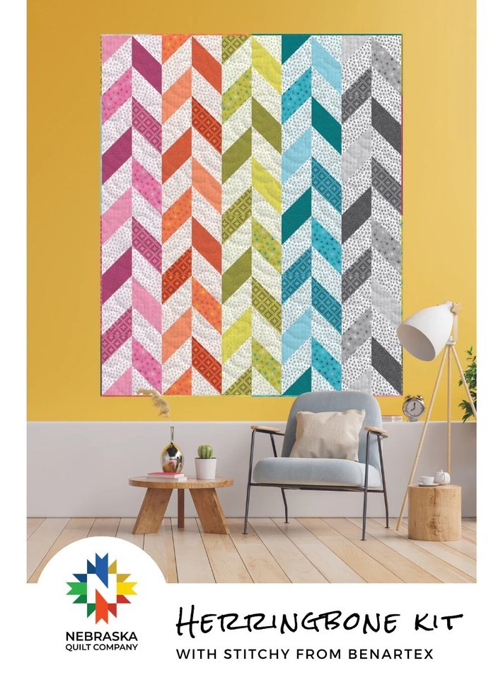 Kit contains Herringbone pattern by Christa Watson of Christa Quilts. Also contains fabric from the Stitchy collection by Christa Watson for Benartex. All fabric to complete quilt top and binding included. Finished quilt top will measure at 50" x 60"