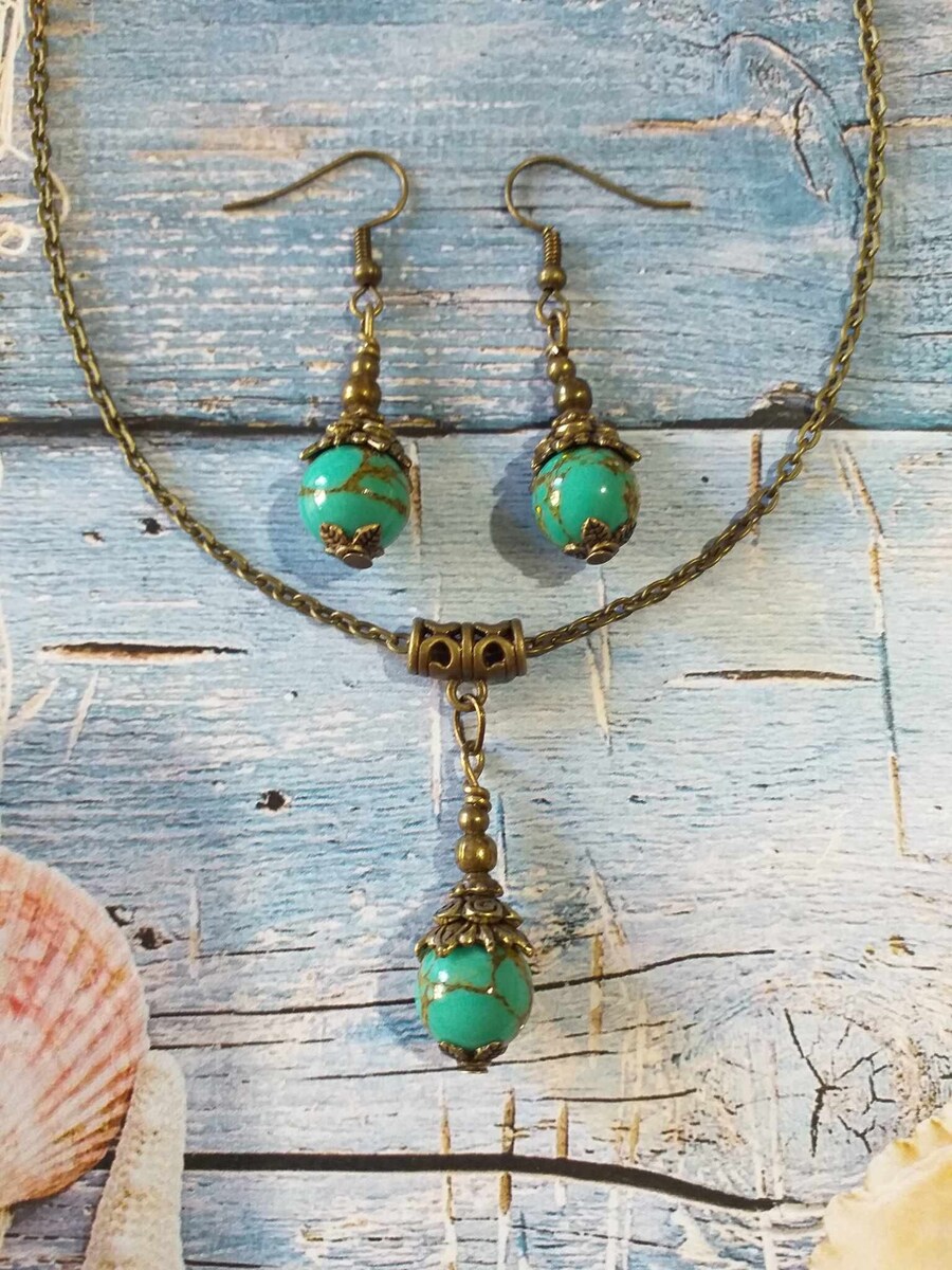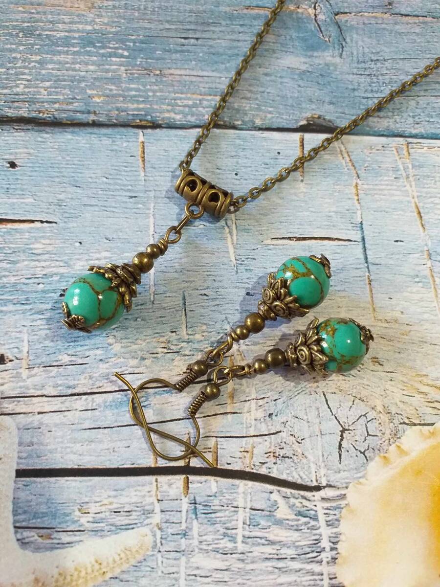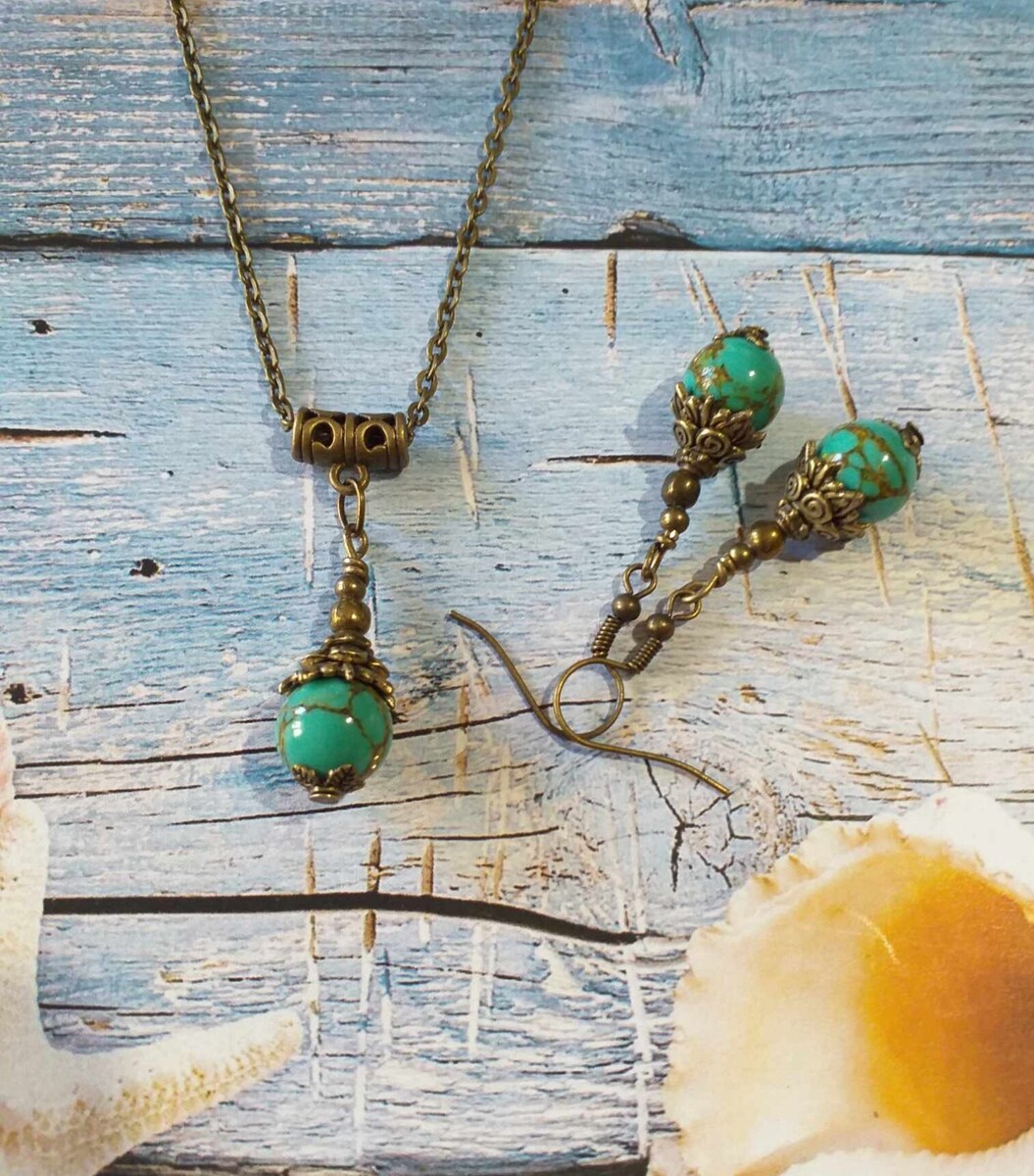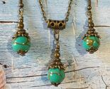 Beautiful Set bronze Victorian Antique style amazing green Azurite necklace and earrings . Beautiful pendant necklace and earrings with green Azurite . Boho necklace . Bohemian necklace and earrings . Victorian necklace and earrings .