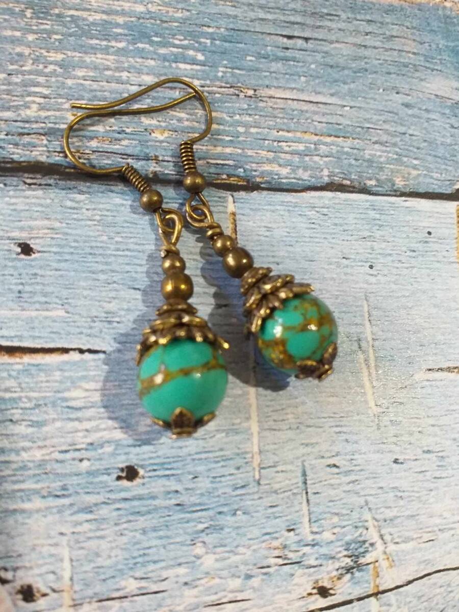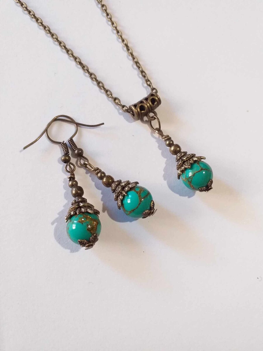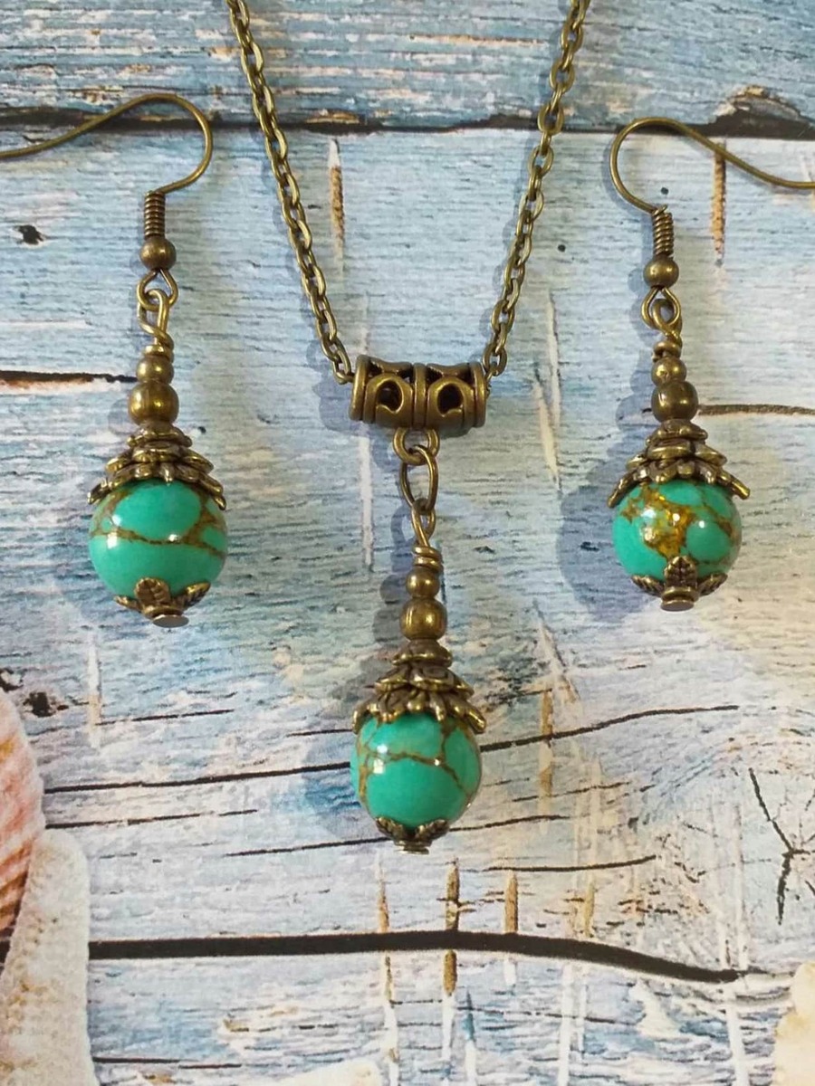 Beautiful Set bronze Victorian Antique style amazing green Azurite necklace and earrings . Beautiful pendant necklace and earrings with green Azurite . Boho necklace . Bohemian necklace and earrings . Victorian necklace and earrings .