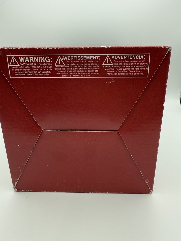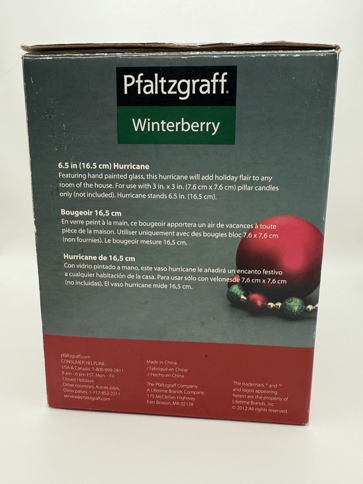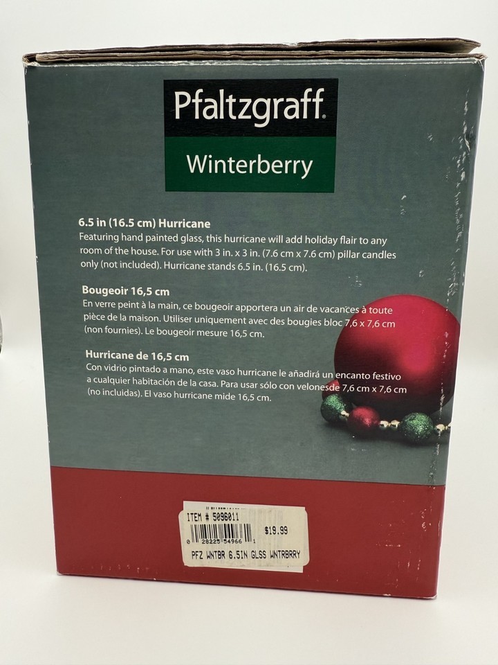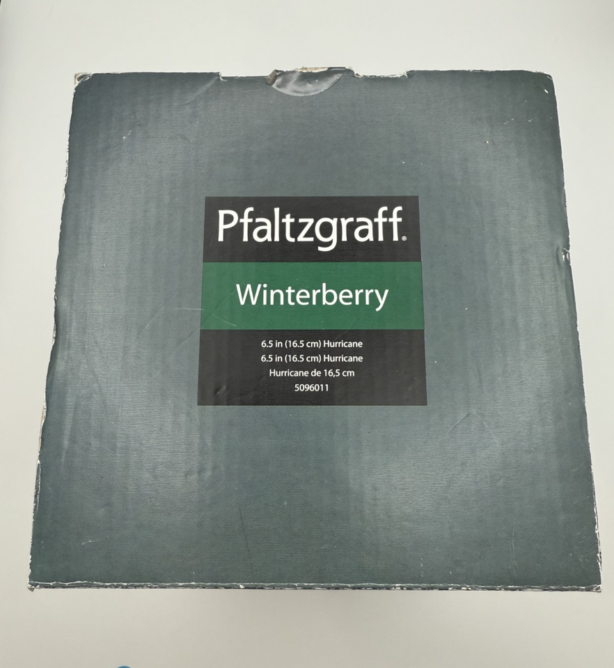 The original box shows a retail price of $19.99, placing this piece in the mid-to-late 1990s production era, when Pfaltzgraff expanded Winterberry into specialty holiday decor items. Unlike the more common clear-stemmed or modular two-piece hurricanes, this red-stemmed model was produced for a short time and is now very difficult to find.