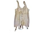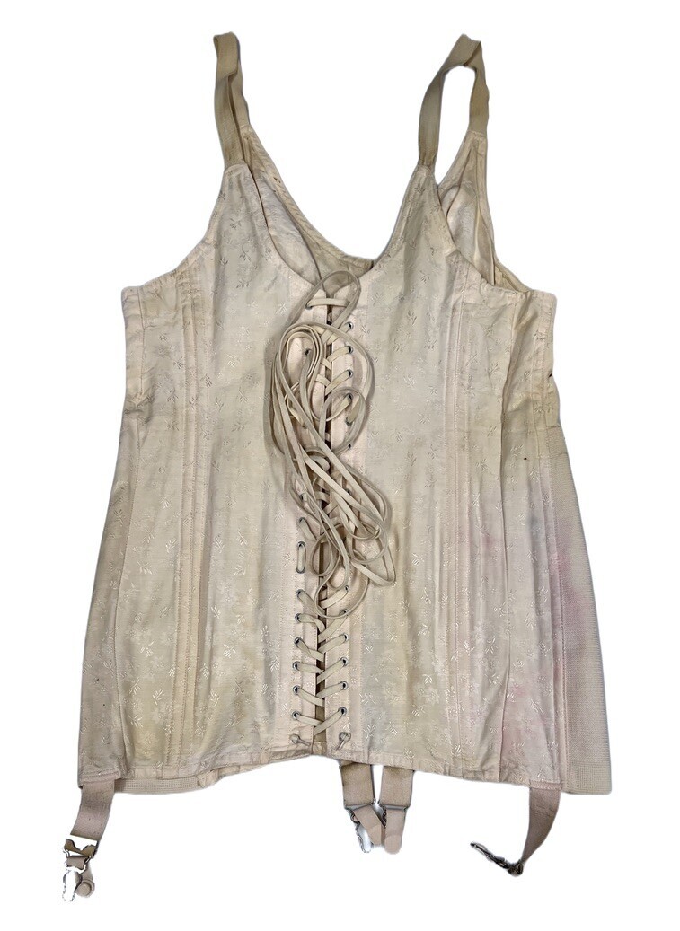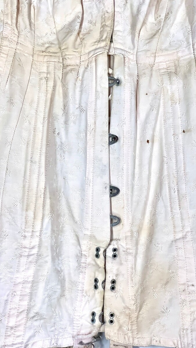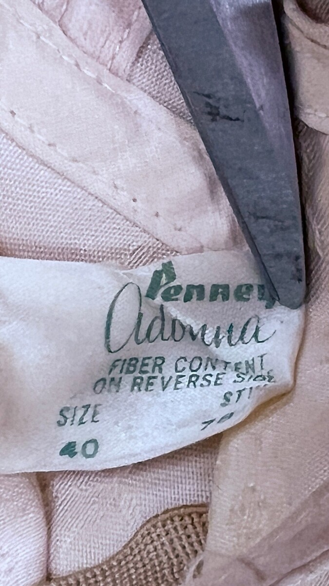 RARE Vtg L/XL 40 CORSELETTE 4 Garters Open Bottom Corset Girdle Brocade Penneys Adonna pink- in stained and well worn-well loved condition. As found. Hooks in front, lace up back. Label states sz 40, Peach floral brocade. Wire-free cups. 4 attached metal garters. Hook and eye closure as well as inside. NON-adjustable straps. The lacing on the back allows for a larger size.