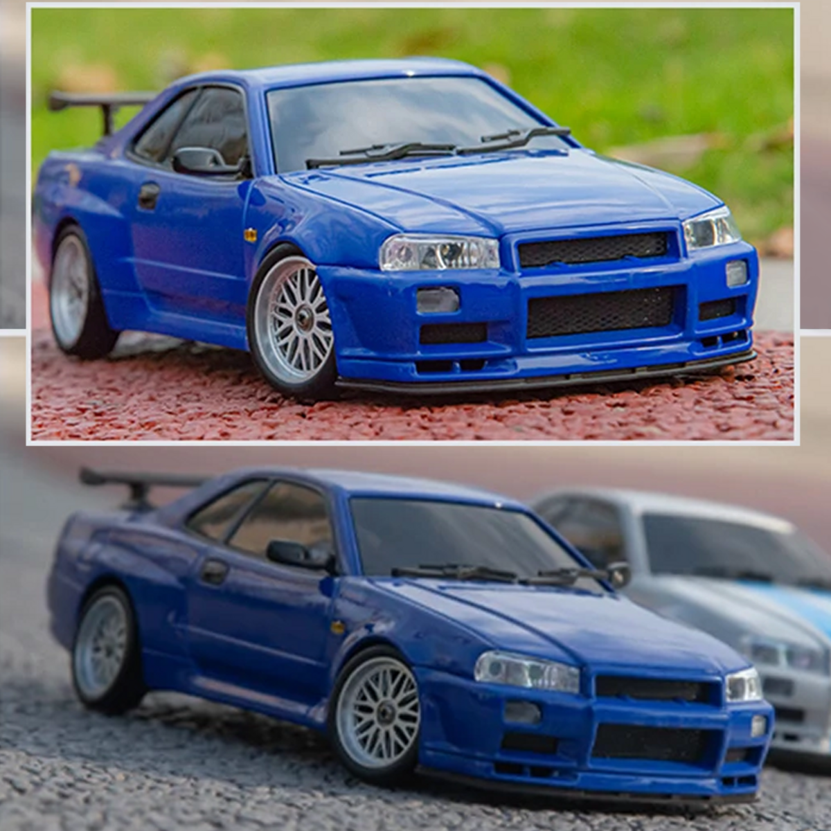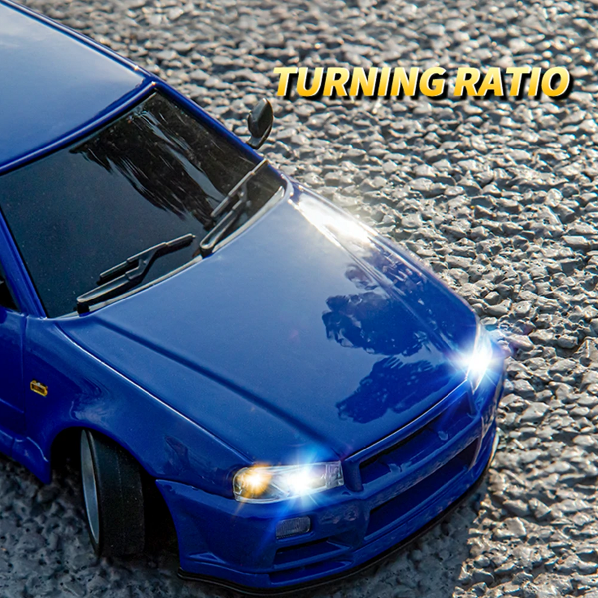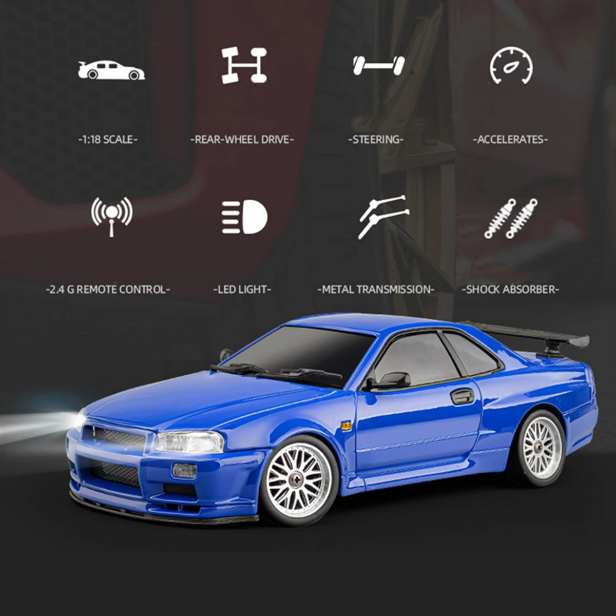 1/18 Restore the classic GT-R R34 Model and the appearance is completed in the actual proportion. Boutique drift, multi -link design. 1/18 RTR RC Drift Car GTR R34 is a high-performance drift car features a gyro system for precise control, LED headlights, and a realistic alloy body shell.