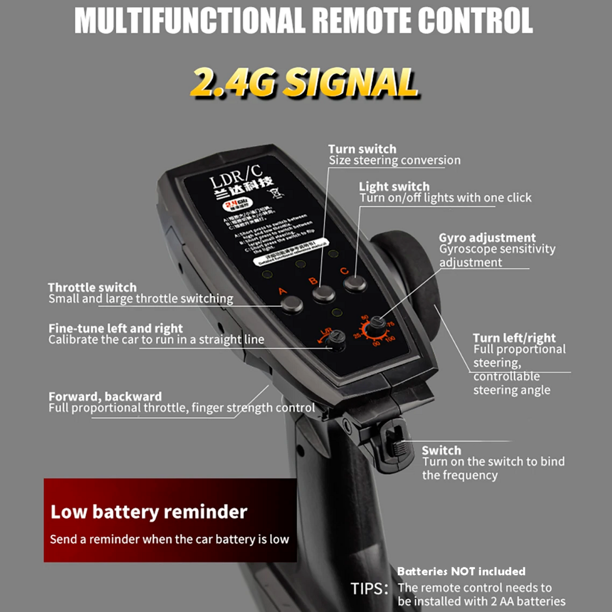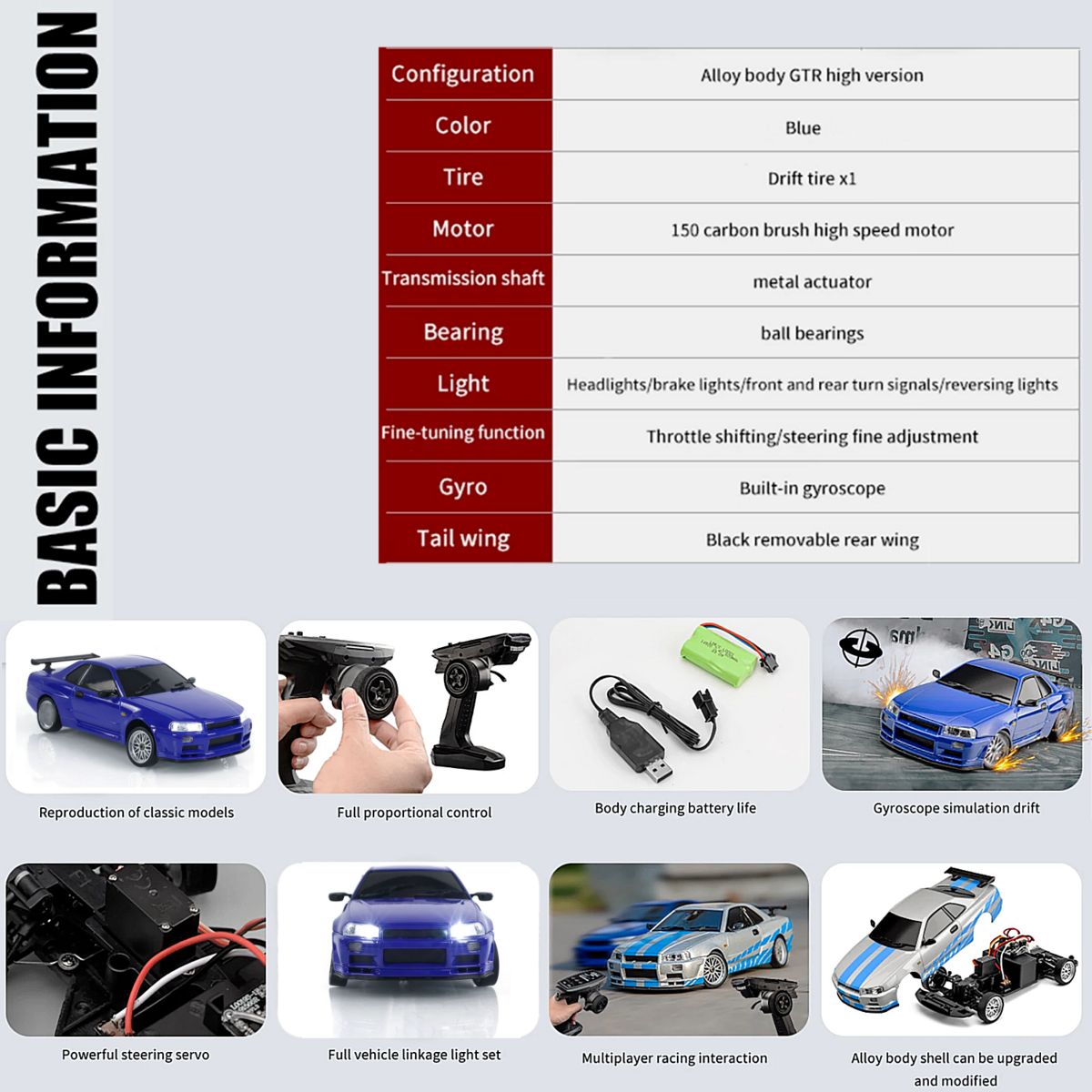 Built-in gyroscope auxiliary system, 2.4G 3 channels remote controller, metal drive shaft, customized 150 high speed motor, drift tires, full car lights system - headlights can be remotely controlled, linkage vehicle lights (steering light, reversing lights, brake lights), four wheel