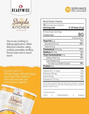 Powder eggs are nutritious and satisfying in many forms. Whether you enjoydried egg powder as omelets or instant snacks or savory and prepped forhousehold recipes, our Simple Kitchen canned powdered eggs give you fresh,quality ingredients with an extended shelf life. Our freeze-dried eggs willbecome a go-to pantry staple when fresh eggs aren?t available or go bad tooquickly. They?re convenient to rehydrate and add to home-cooked lunches anddinners or eat straight from the package. They?re also perfect to portion outas dried snacks when making meals on the run or to add nutrition to breakfastsand baking recipes. Preparation instructions: Open the can and discard theoxygen absorber. For one egg equivalent, mix 2 1/2 tbsp. whole egg powder and2 1/2 tbsp. of warm water. Cook as desired. Use in any cooking or bakingapplication. Make delicious omelets, cakes, cookies, pancakes, muffins, frenchtoast, and so much more! If using with other dry ingredients, reconstitutingis not necessary. Just add to other dry ingredients and increase the liquidsby the required amount. Refrigerate any unused product after rehydrating. AtReadyWise Food, we lead the food industry when it comes to great freeze-driedmeals and dehydrated food for any situation. This is why we created our uniqueline of everyday kitchen essentials. Made from a combination of freeze-driedand dehydrated ingredients, each Simple Kitchen product tastes great and lastsup to 3 years. From creamy soup and toothsome desserts to freeze-dried fruitsand veggies, Simple Kitchen is the perfect way to snack for your busy on-the-go life. Whether you?re stocking emergency-preparedness supplies or lookingfor quality backpacking food, ReadyWise meals are easy, nutritious, and readyto go when you need them. Check out our entire selection of emergency,adventure, and everyday freeze-dried and dehydrated meals.