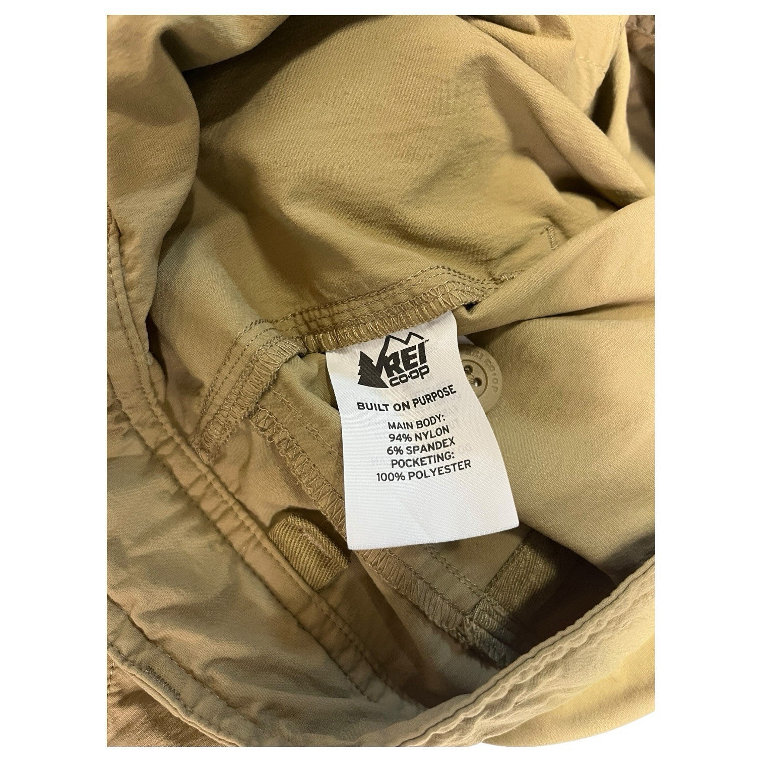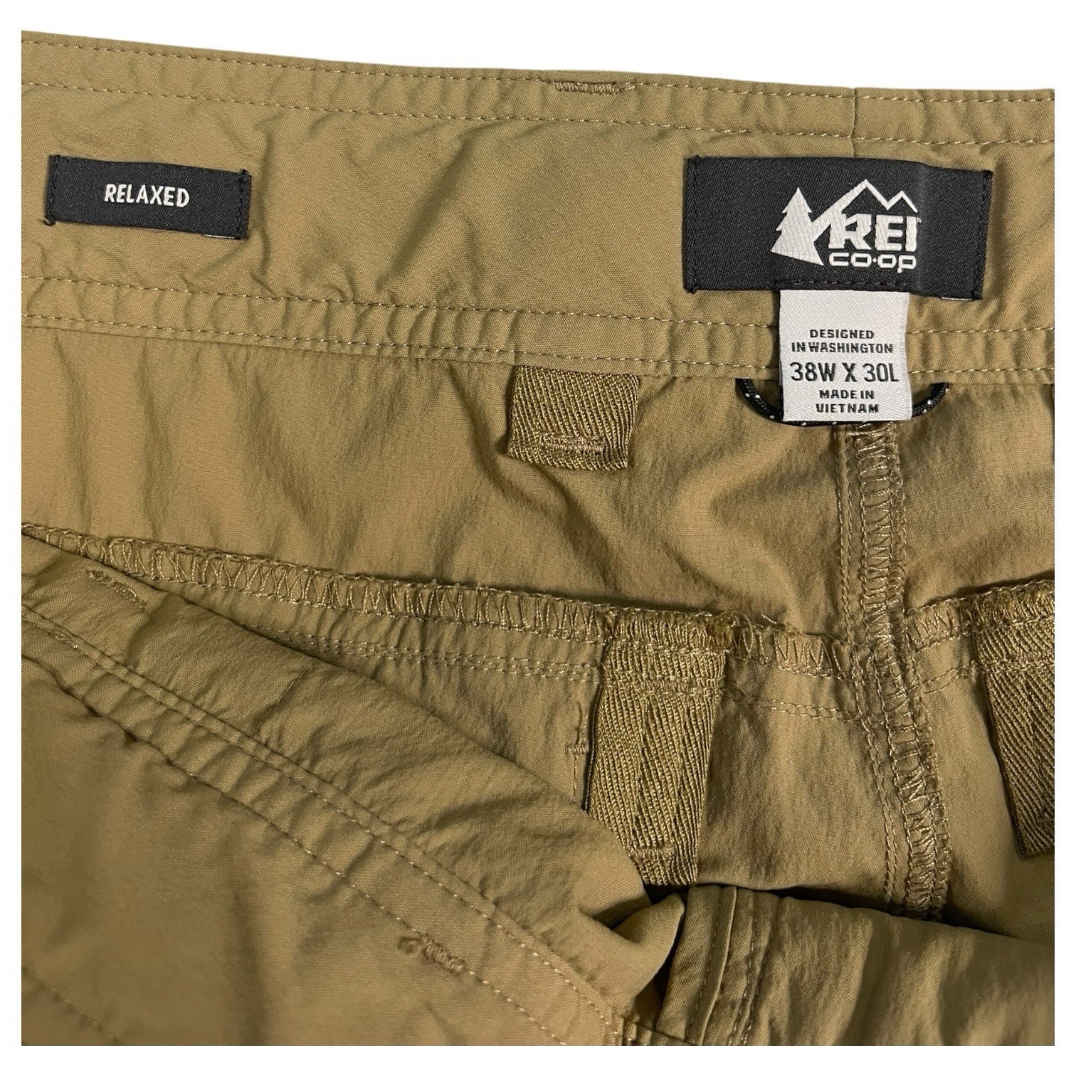 REI Co-op Pants Mens 37x29 Khaki Relaxed Fit Cargo Hiking Lightweight Nylon Outdoor, Hiking, Lightweight Condition: Gently worn condition, light wear with no notable flaws observed Relaxed fit cargo hiking/outdoor pants in khaki tan Lightweight quick-dry performance fabric (label notes: Lite Fabric) Partial elastic waistband with belt loops; button closure with zip fly Multiple pockets: hand pockets, cargo pockets, and back pockets Brand details: REI Co-op woven patch; interior tag shows RELAXED fit and Designed in Washington Tag size: 38W x 30L Approximate measurements (from photos): - Waist (flat): 18.5 in - Length: 40 in - Rise: 11 in - Inseam: 29 in Good pre-owned condition - loose threads - see pics and ask questions for more details.