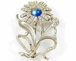 Vintage Silvertone daisy brooch with a blue cabochon center and rhinestone accents measures 1 3?4? x 2 1?2?. There are four rhinestones missing, otherwise excellent condition. 1930s era.