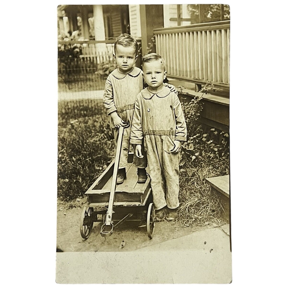 RPPC AZO Real Photo Postcard Twin Boys w/ Wagon Early 1900s Lexington Ky Estate