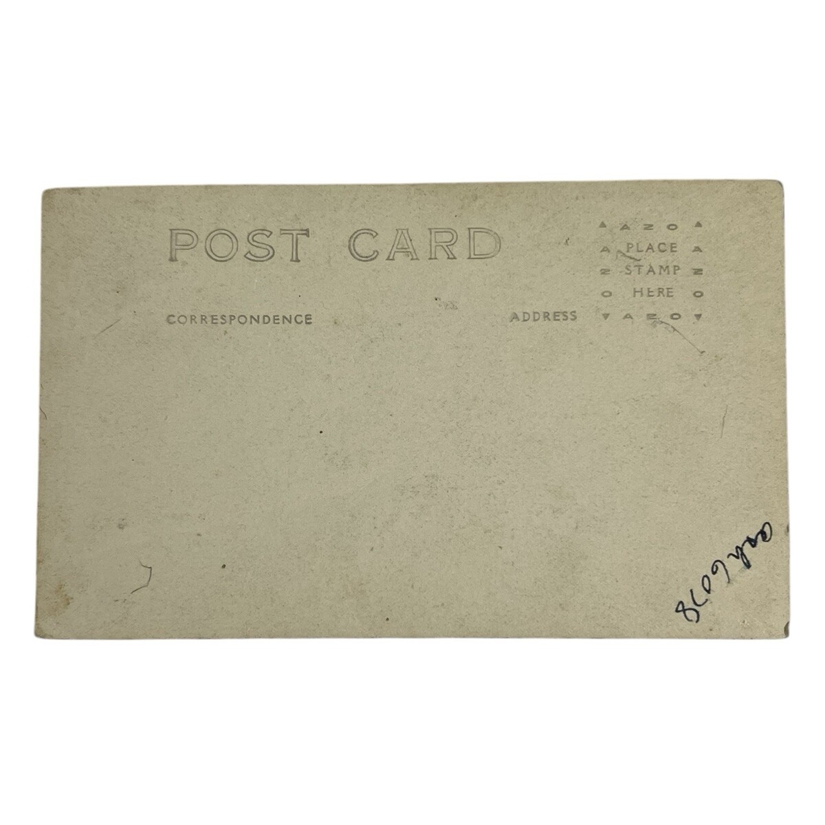 Charming early real photo postcard showing two young boys standing with a pull wagon in front of a porch. Printed on AZO postcard stock (four triangles up), dating it to roughly 1907?1918. Unposted, with a divided back and handwritten number in corner. Excellent detail and contrast ? period clothing and expressions perfectly capture the era. From a Lexington, Kentucky estate. Condition: Minor edge wear and light age toning typical of postcards from this era; overall very good vintage condition. A delightful and well-composed antique image for collectors of early children?s portraits and RPPCs. real photo postcard, RPPC, AZO postcard, twin boys, children portrait, vintage wagon photo, early 1900s postcard, Lexington KY estate, antique photograph, collectible RPPC, Edwardian children, family portrait, vintage real photo