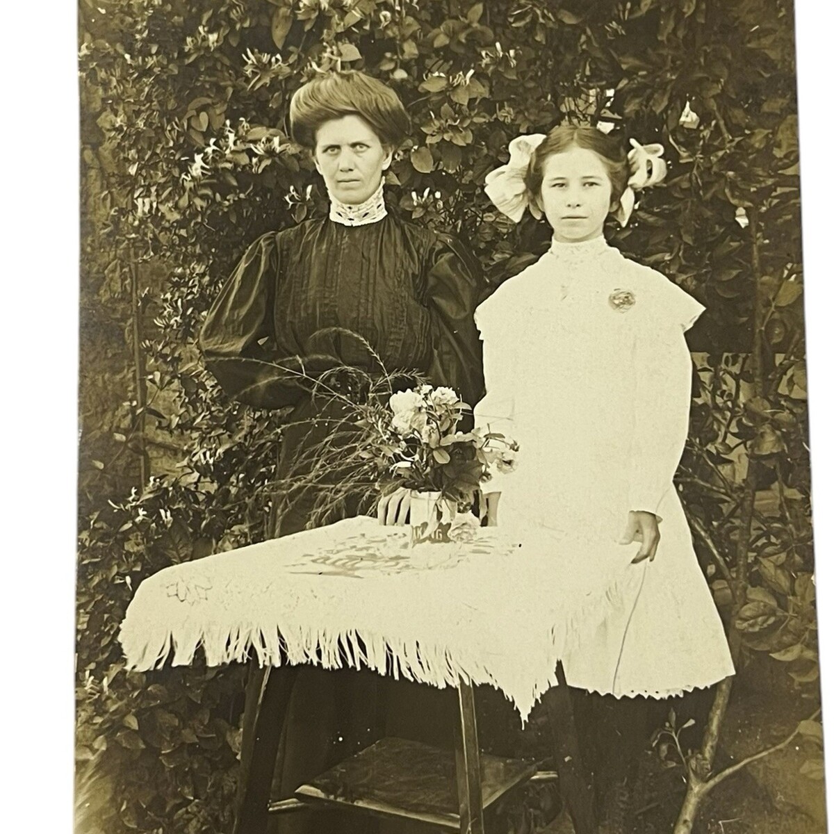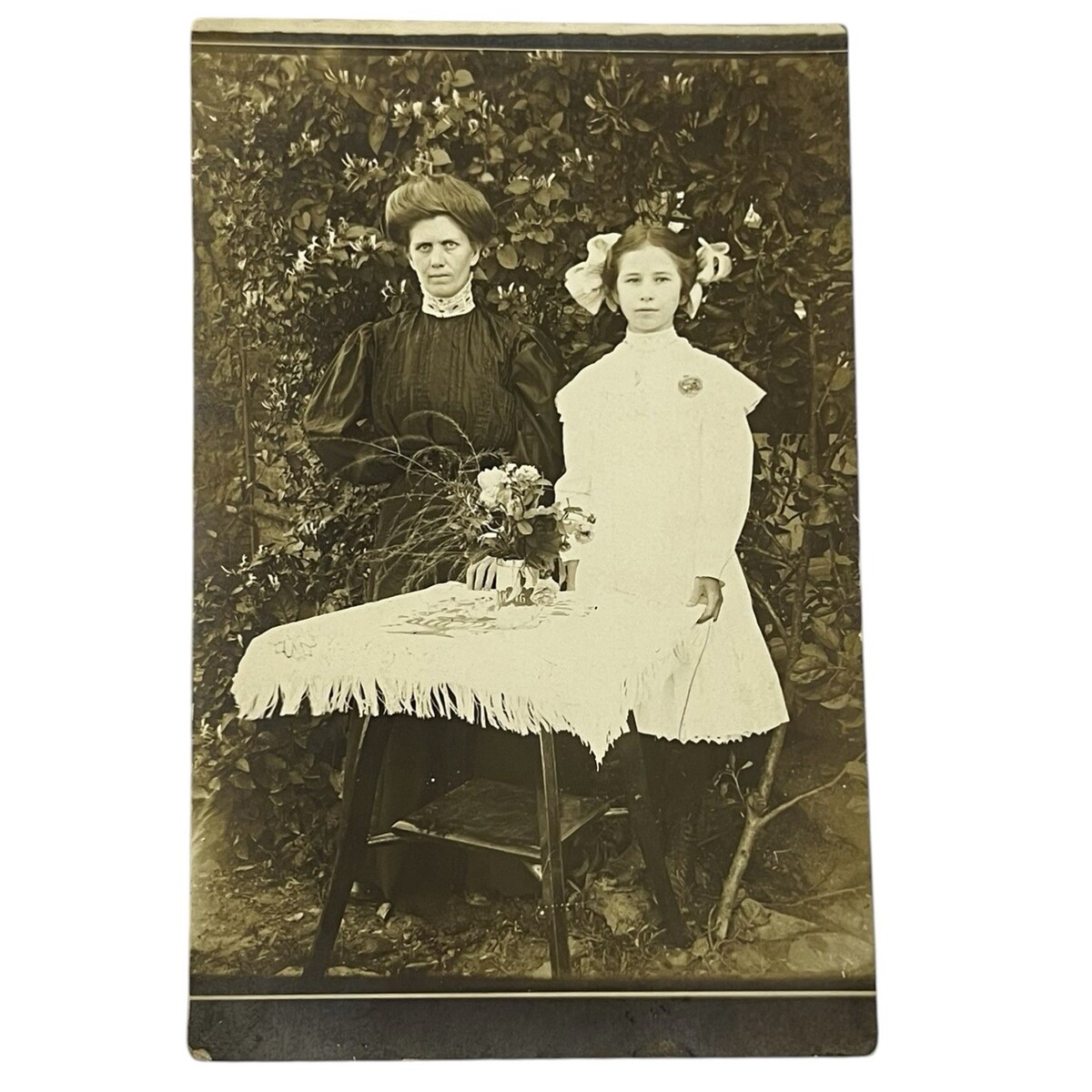 Early 1900s real photo postcard showing an Edwardian woman and young girl posed outdoors beside a small table with flowers. Excellent tonal range and clarity ? likely taken circa 1908?1915, consistent with the card stock and divided back format. Unposted, with blank back. Sourced from a Lexington, Kentucky estate. Condition: Light age wear and a faint corner bump, overall excellent for age. A striking early photographic portrait with strong period detail ? suitable for collectors of Edwardian or family portrait RPPCs. real photo postcard, RPPC, Edwardian portrait, mother daughter photo, antique family photo, early 1900s photo, divided back postcard, Lexington KY estate, vintage photograph, outdoor portrait, collectible postcard, RPPC portrait