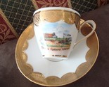 RW Rudolph Wachter, Germany, "Granna Guillene Uttern" inscription, coffee cup and saucer, gold and white Pattern, [4-49] cup is 2 " tall by 2 1/4" and saucer is 4 1/2", gorgeous gold and country scene 94BSKTRACK5