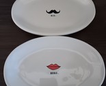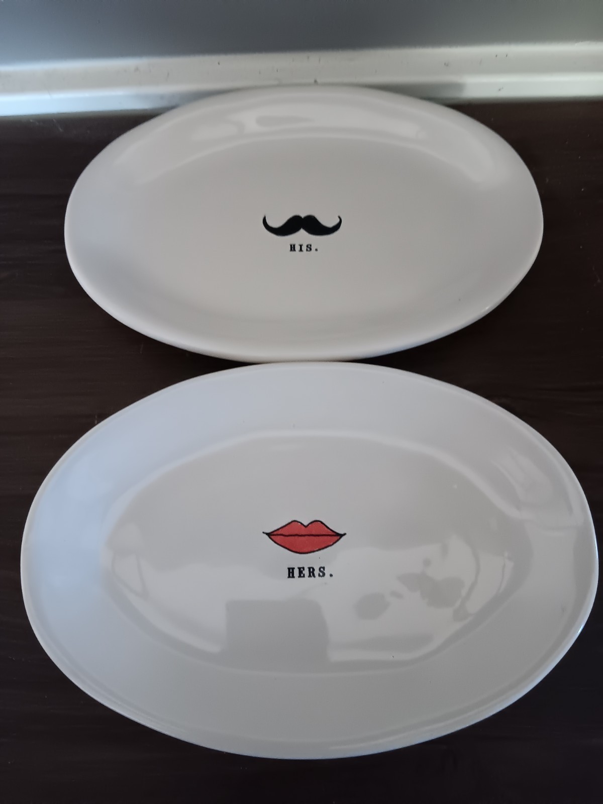The Rae Dunn his and her mini plates are a set of ceramic plates in white, featuring a glossy finish and printed branding. Made in China using pottery techniques, these plates have a contemporary design and are part of the 21st-century production style. Perfect for adult use, this original set includes a plate for both him and her, adding a touch of elegance to any table setting.