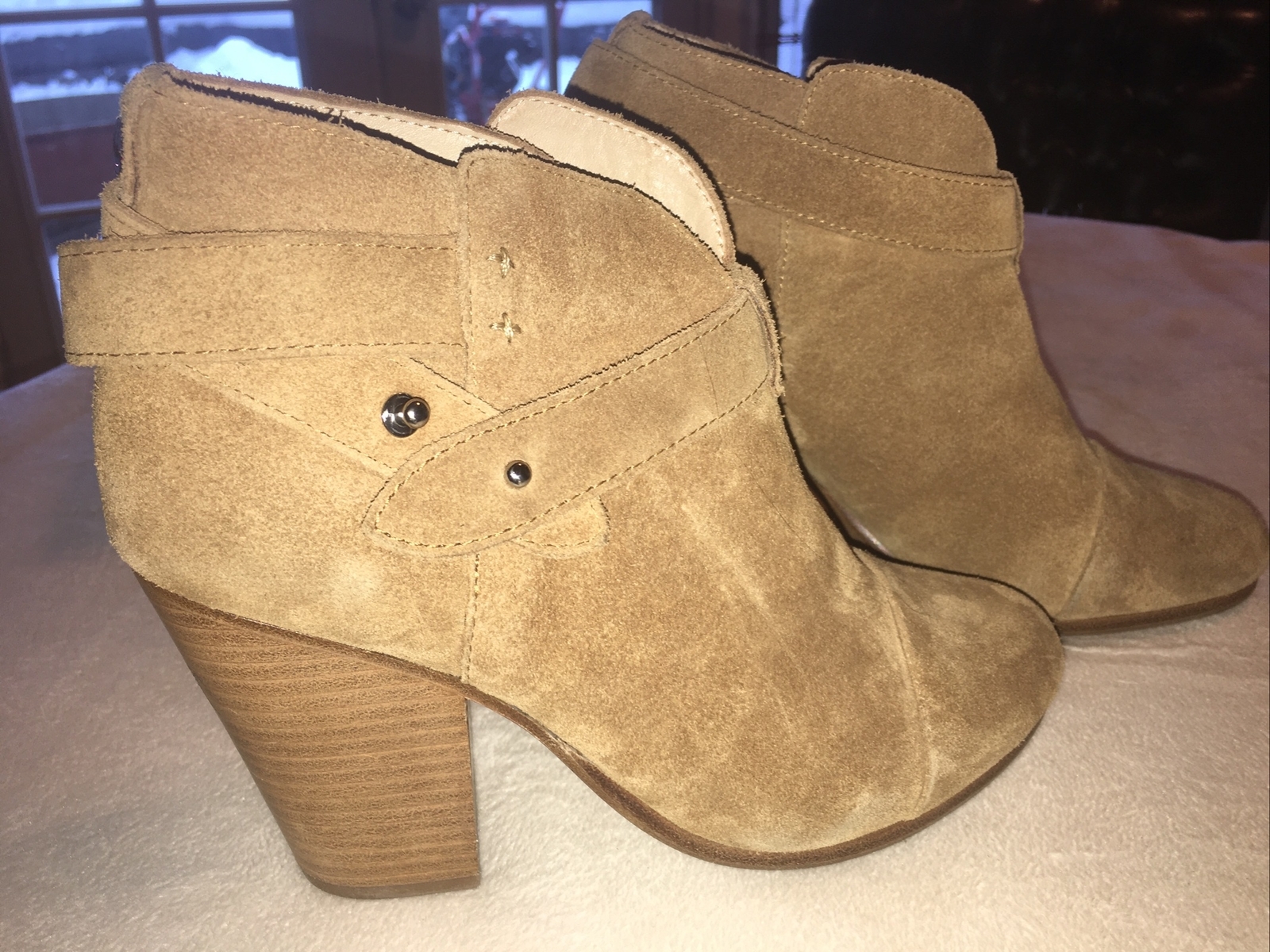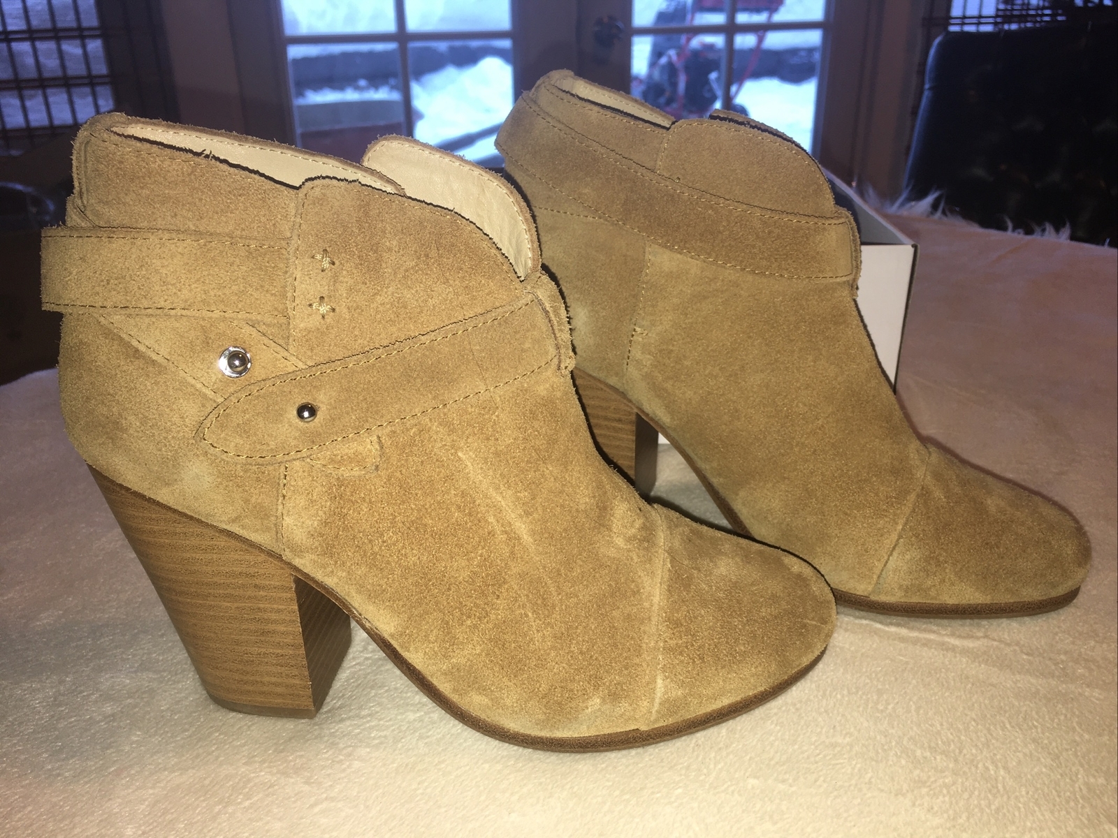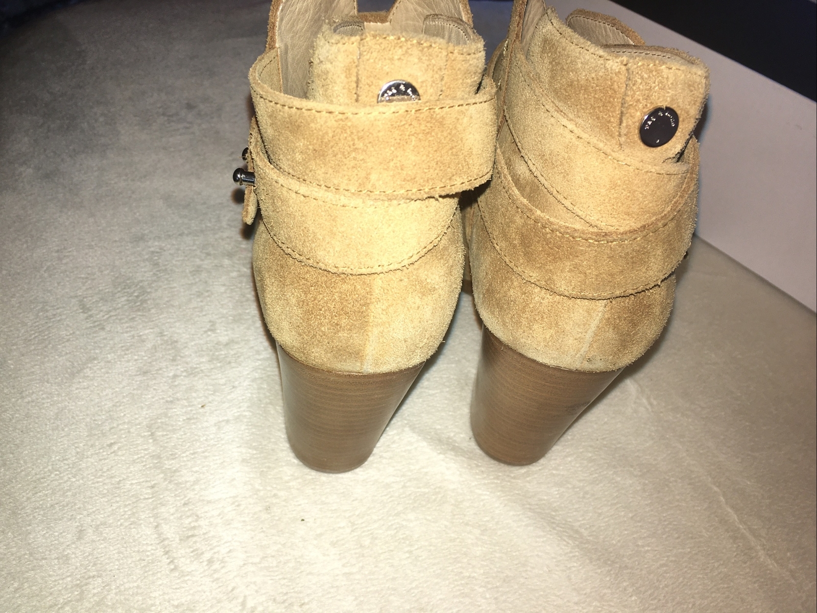 100% AUTHENTIC-Rag Bone Harrow Ankle Bootie BOOTS Suede sz 37 NEW Crafted with signature pushpin hardware and wraparound straps, this cult-favorite, stacked-heel boot is revered for its effortlessly cool, cap-toe silhouette and yearlong, casual versatility. Tan Nubuck color. soft tan suede. 3" heel 3 1/2" boot shaft Leather upper, lining and sole. made in Italy Retails for $425