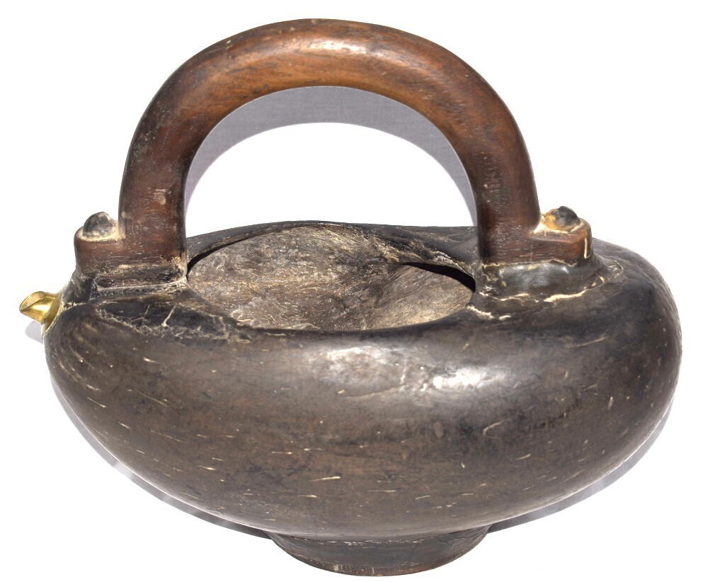 This is a Rare Kamandal in Perfect condition , which is made up from natural sea coconut (Daryai Nariyal) also known as Coco-de-mer. Kamandalam is a water pot with a handle used by Hindu and other religious sadhus, sanyasis, munis, yogis, ascetics, Buddhist monks and Hindu mendicants to carry water and there foods. Kamandalam represents a self-contained and simple life. Kamandalam is also called as Kamandal or Kamandalu. It is traditionally made out of ripe bottle gourd, or pumpkin, or coconut shell, or from wood of the Kamandalataru tree. It is said that the water in a traditional Coconut Kamandalam is equivalent to Amrutam, the elixir of life; hence it represents life, continuity, fertility, and prosperity. It is depicted that Hindu Gods and sanyasis carry the traditional Kamandalam in t