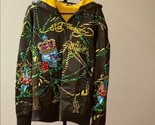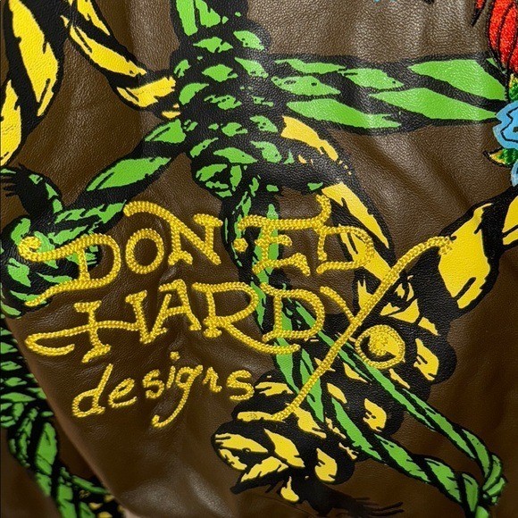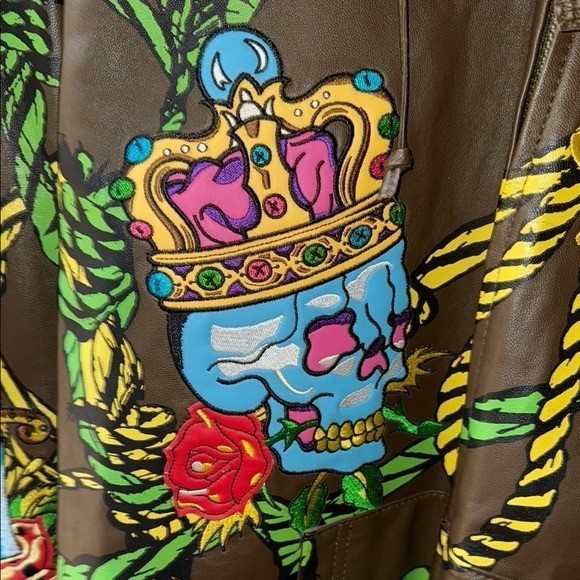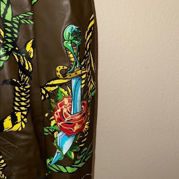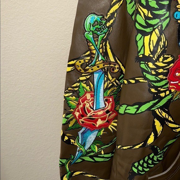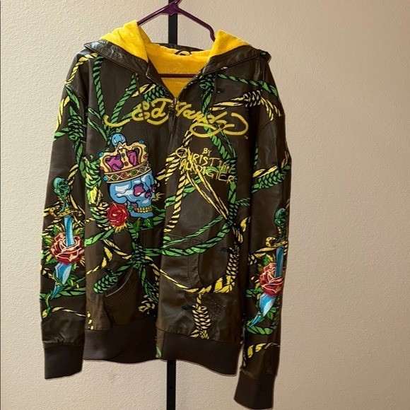 Vintage and rare. Like new condition. Bold Ed Hardy hooded leather jacket. Features vibrant heavily embroidered graphic designs. Fleece lined hood, front and back. Sleeves lined in yellow satin. Front kangaroo pockets. Perfect for a standout look.