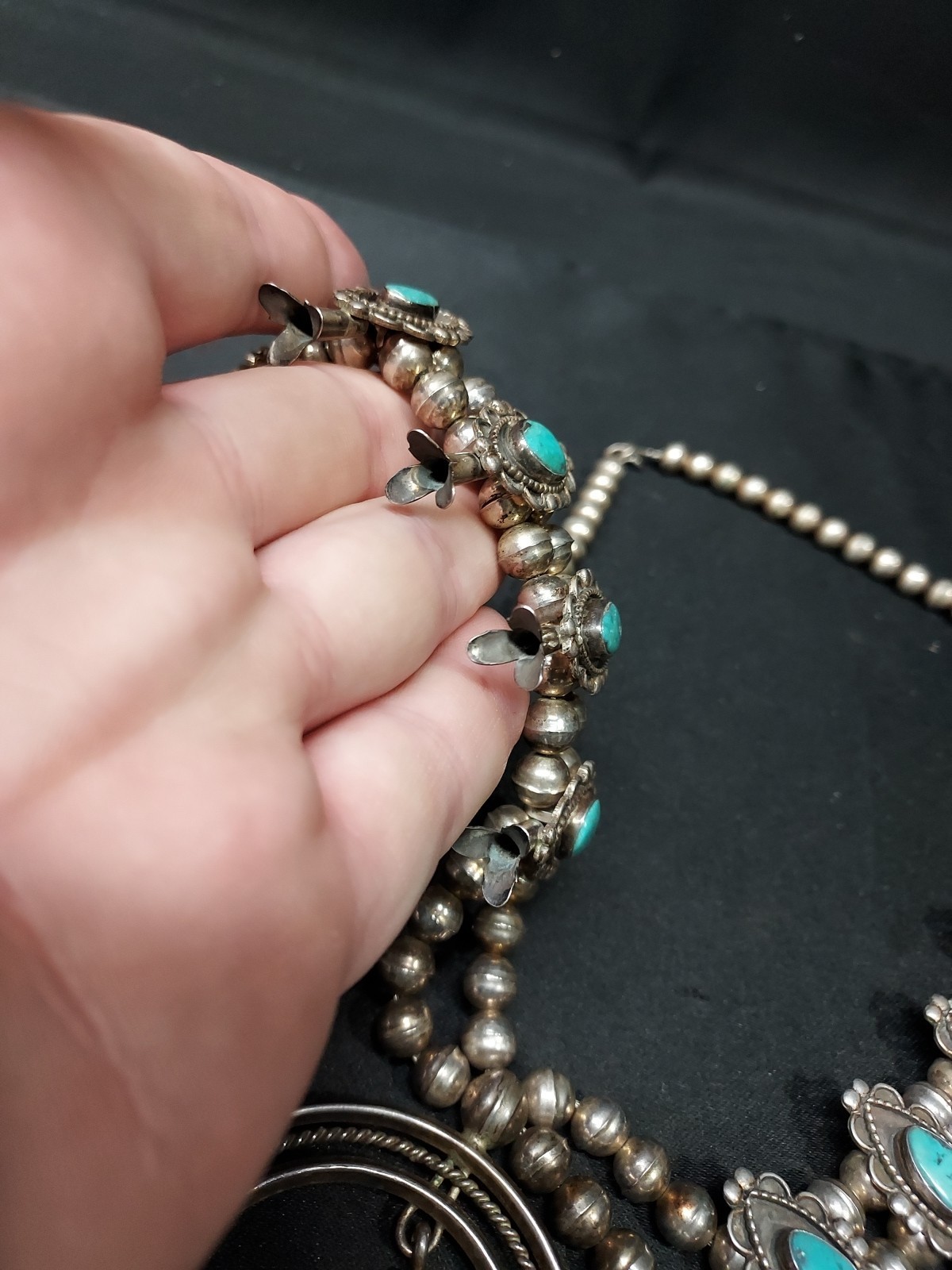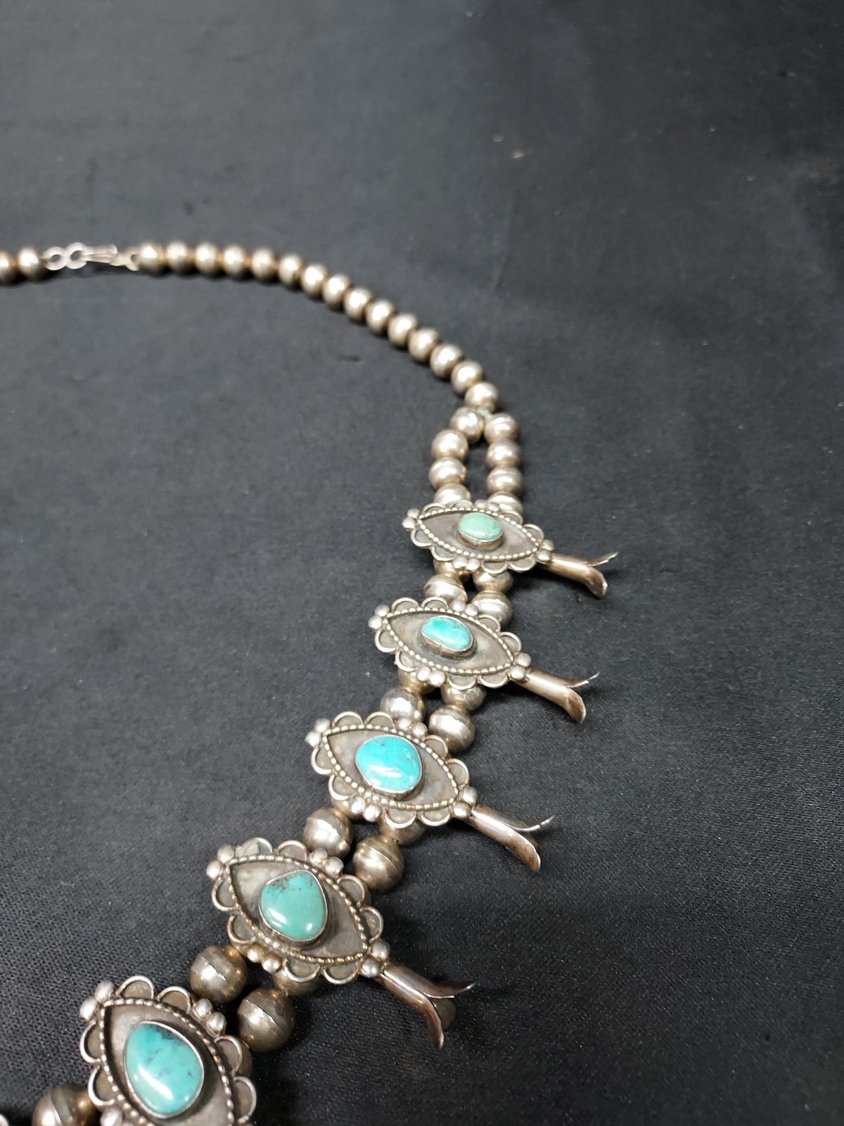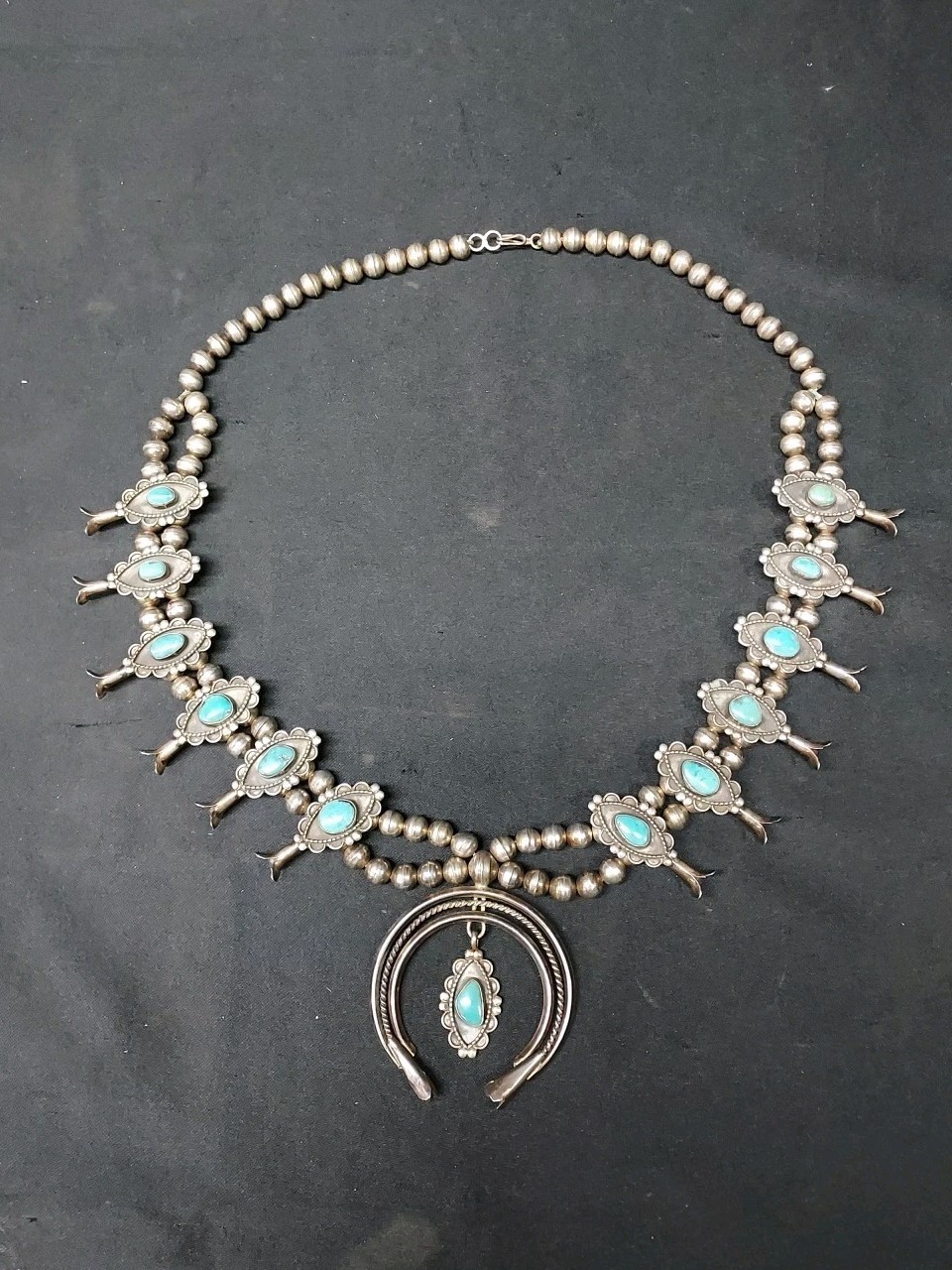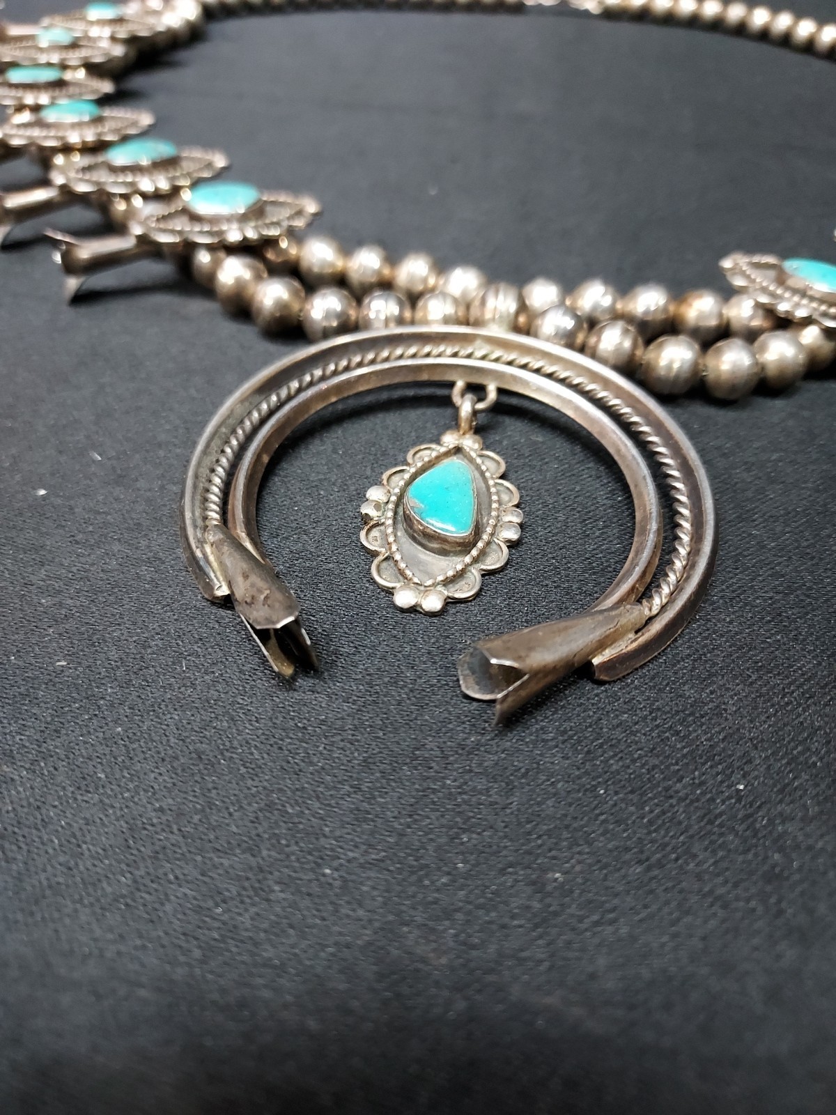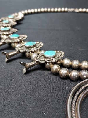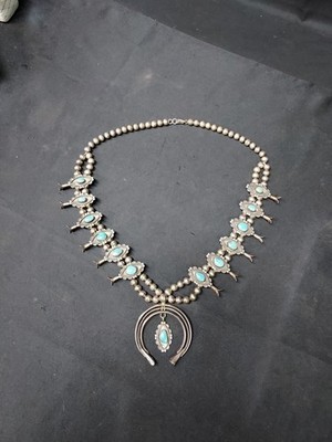 - Rare Vintage Navajo Sterling Silver Squash Blossom Turquoise Necklace & Pendant