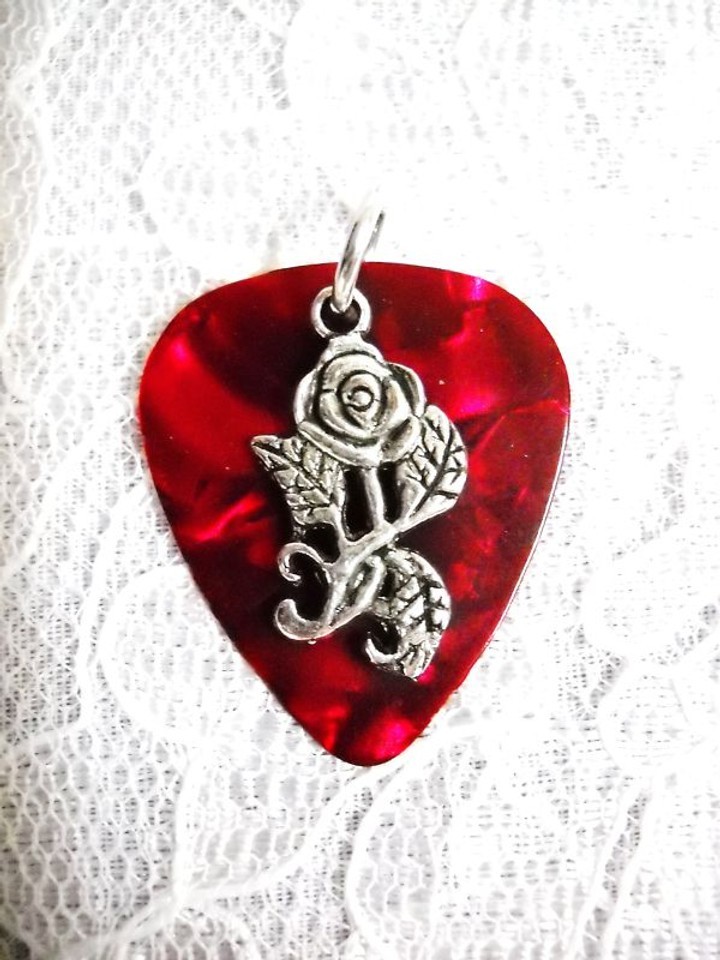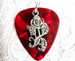 It is a NEW DEEP BLOOD RED CELLULOID GUITAR PICK WITH A SILVER ALLOY OPEN STEM ROSE FLOWER CHARM PENDANT NECKLACE - RED ROSE THEME