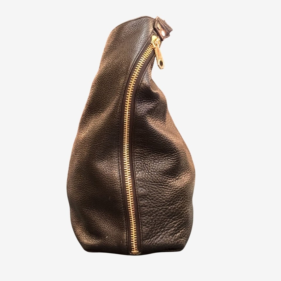 This is one of Rebecca Minkoff's earlier leather hobo designs, likely from the early 2010s, and features gold-tone hardware, side zip pockets, and a classic silhouette ? a style that's no longer in production. While not quite vintage yet, it offers the timeless slouchy shape and high-quality leather that defined her original handbag original handbag line.