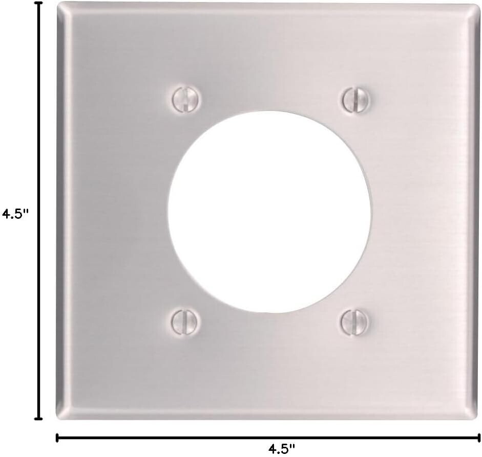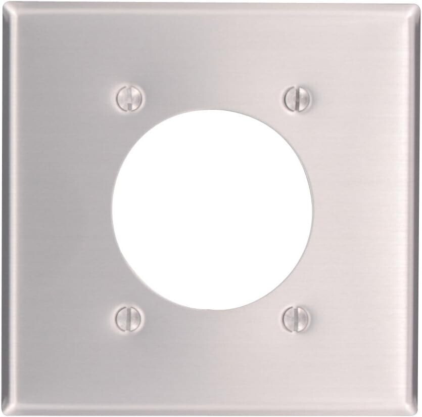 Receptacle Wallplate 4-1/2'' L x 4-9/16'' W 2-Gang Aluminum - Leviton 83026 Suitable for: Traditional Leviton Devices Leviton Wallplate, Standard-Size, 2 Gangs, Flush Mounting, Aluminum, Silver, Aluminum, 2-5/32 in Hole, 4-1/2 in Length, 4-9/16 in Width, 0.22 in Thickness, Suitable for: Traditional Leviton Devices 2-Gang, (1) 2.150 Inch Hole Single Device Receptacle Wallplate, Standard Size, Material: Aluminum, Flush Mount - Color/Finish: Aluminum. 2-Gang Flush Mount 2.15-Inch Diameter, Device Receptacle Wallplate, Standard Size, Device Mount, Aluminum Also known as: 078477424803, 83026, LEV83026 Size Standard Height 4.5" Defective Code A Number of Switch Openings 1 Color Silver Number of Gangs 2 Wall Plate Style Receptacle Shape Square Width 4-9/16" Number in Package 1 pk Product Type Wall Plate Material Aluminum Each Weight 0.100 LB Thickness 0.22" Hole Size 2-5/32" Application For commercial or residential applications Length 4-1/2" Finish Aluminum Mounting Type Flush Type Standard-Size Hole Diameter 2.15"