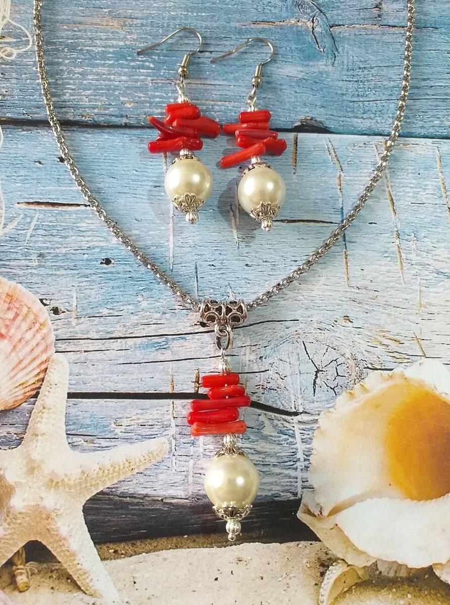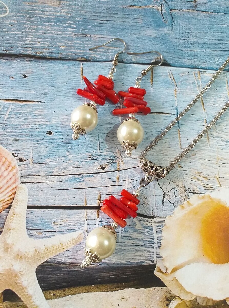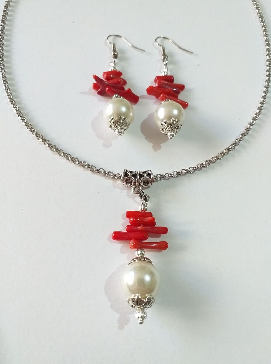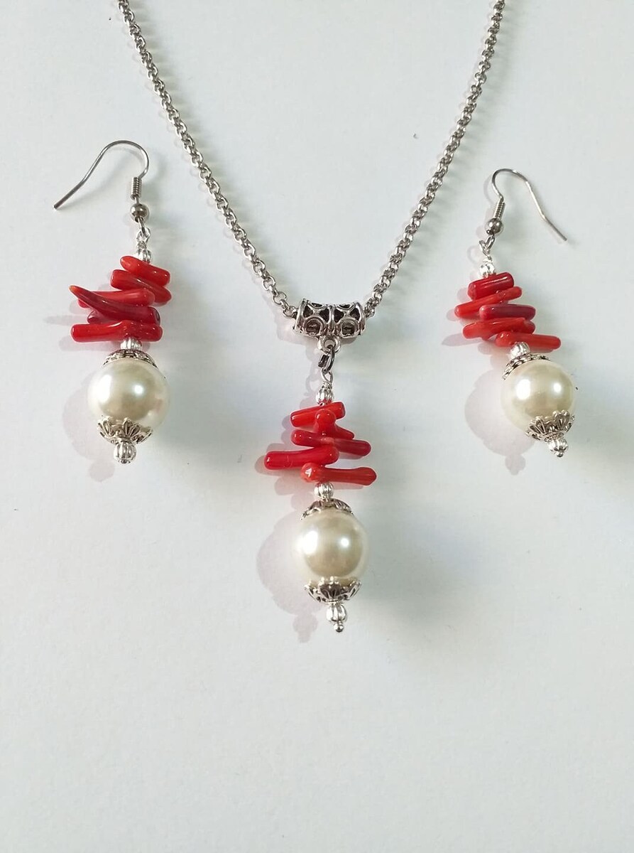 Amazingly beautiful silver-tone Victorian style red Coral and crystal white pearl beads jewelry set pendant necklace and earrings . Antique style silver-tone red coral and crystal pearls jewelry set necklace and earrings . Boho jewelry set necklace and earrings . Bohemian jewelry set necklace and earrings. Red and white Silver-tone beautiful jewelry set . Coral jewelry set necklace and earrings . Baroque style jewelry set necklace and earrings . Bridal jewelry set. Bridesmaids jewelry set.