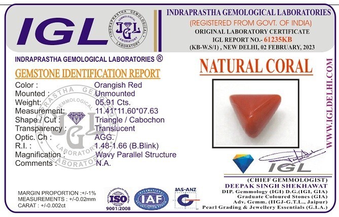 Red Coral Triangular - 5.91 Carats - Italian - IGL Certified