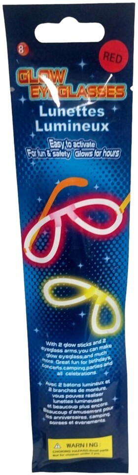 Red Glow Stick Eye Glasses. Easy to activate. For fun and safety. Glows for hours. With 2 glow sticks and 2 eyeglass arms, you can make flow eyeglasses and much more. Great fun for birthdays, concerts, camping, parties and all celebrations. Contents: 2 Glow sticks. 1 Eyeglass Bridge. 2 Eyeglass arms. Recommended ages 3+. DDD-79328-GLASSESRED